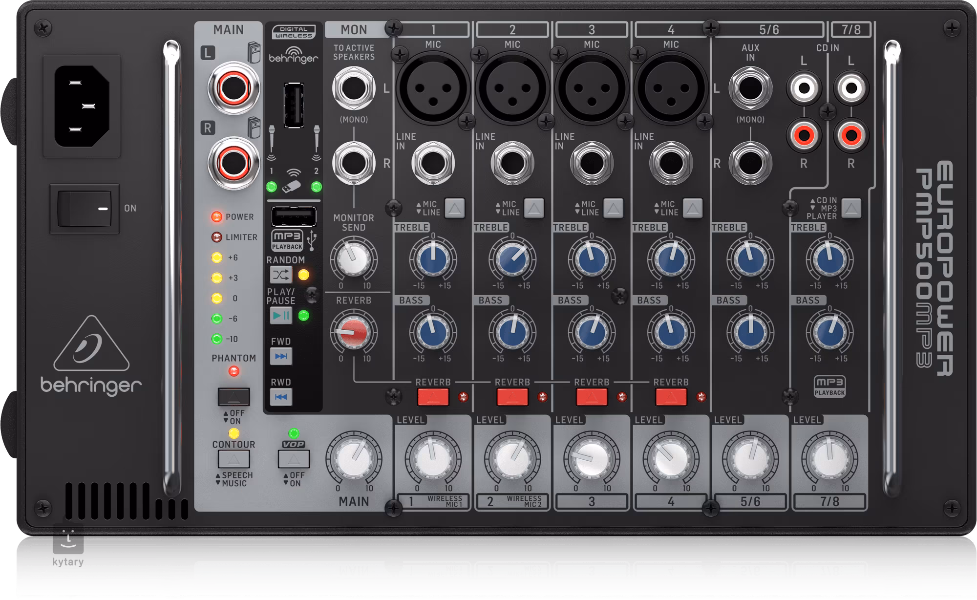 Behringer PMP500MP3 je osmikanálový mixážní pult s vestavěným zesilovačem o výkonu 500 W, multifunkčním procesorem KLARK TEKNIK a možností bezdrátového připojení.