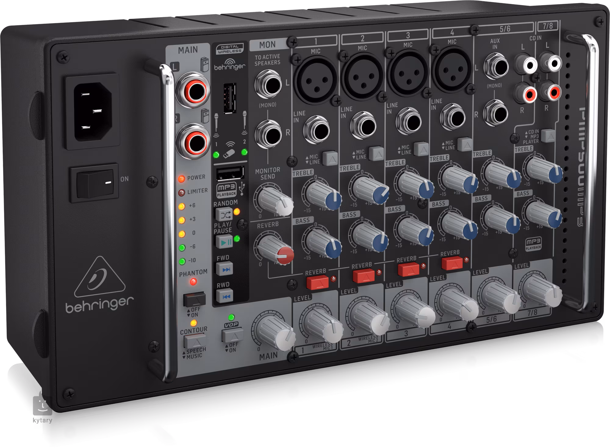 První 4 kanály s konektory XLR jsou vybaveny vysoce kvalitními mikrofonními předzesilovači XENYX. Ty jsou rovněž doplněny možností fantomového napájení +48 V, takže můžete používat i kondenzátorové mikrofony studiové kvality. Zbylé čtyři kanály jsou koncipovány jako stereo vstupy, přičemž kanál 5/6 je vybaven konektory Jack 6,3 mm a RCA cinch a kanál 7 /8 konektory RCA cinch a USB vstupem s vyhrazenými transportními funkcemi pro přehrávání MP3 z flash disků. Každý vstupní kanál je vybaven vysoce muzikálním dvoupásmovým ekvalizérem (basy a výšky). Optimalizace systému nemůže být jednodušší, stačí stisknout přepínač Music/Speech a vybrat správnou ekvalizaci pro váš účel. Zahrnuta je také uživatelsky deaktivovatelná funkce Voice-Over-Priority, která automaticky sníží hlasitost stereofonních kanálů, pokud jste u mikrofonu. Výstup tvoří dvojice konektorů jack 6,3 mm, které přenáší silový signál vhodný pro připojení pasivních reproboxů, např. B212XL.