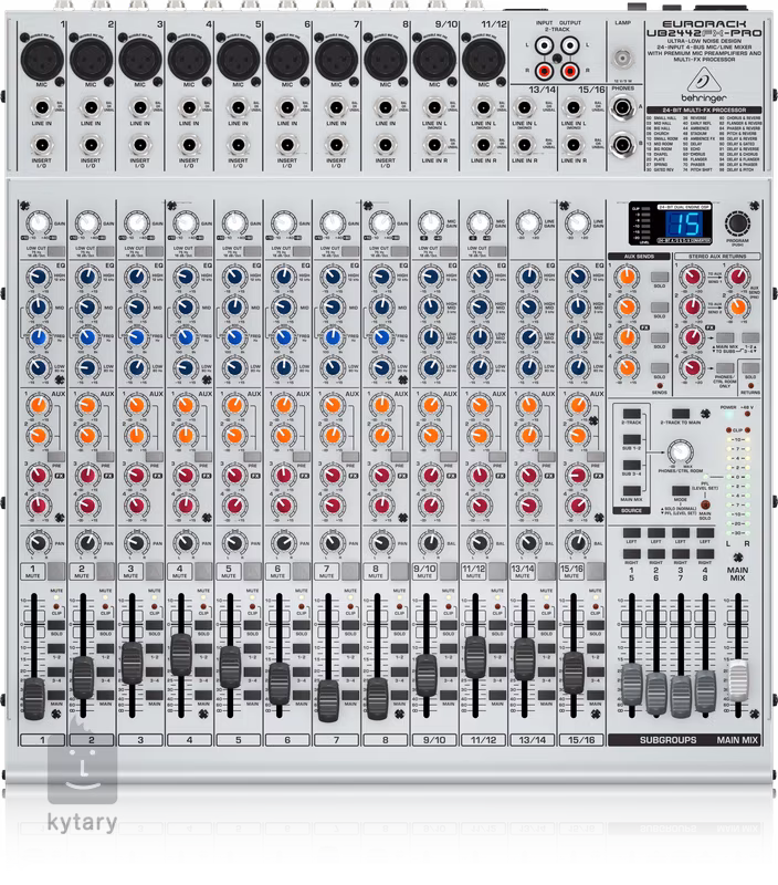 Behringer Eurodrack UB2442FX-PRO je profesionální mixážní pult s ultranízkým šumem vhodný pro živé zvučení i do studia. Ve výbavě nechybí předzesilovače IMP se 130 dB dynamickým rozsahem a vzorkovací frekvencí 24-bit/96 kHz, ekvalizéry britského střihu, čtyři bus sběrnice nebo efektová jednotka.