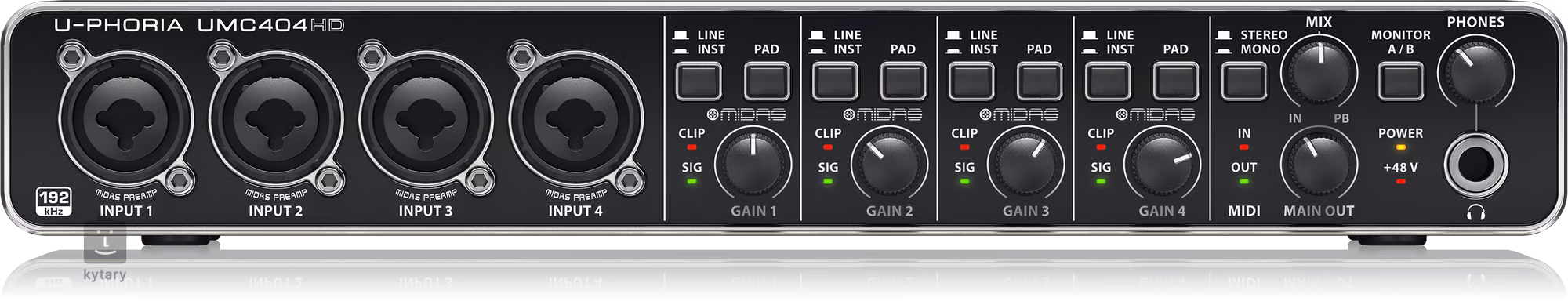 Přední strana U-PHORIA UMC404HD obsahuje čtyři kombinované konektory pro mikrofony a nástroje. Každý kanál je potom vybaven unikátním mikrofonním preampem od MIDAS, fantomovým napájením a LED diodami pro maximální přehled. Hlasitost jednotlivých vstupů upravíte prostřednictvím knobu Gain a charakter vstupního signálu zvolíte na dvoupolohovém přepínači LINE/INST. Přední panel dále obsahuje Mix pro nastavení poměru vstupního signálu, Main out pro všechny kanály nebo sluchátkový výstup s nulovou latencí a separátním ovladačem hlasitosti.