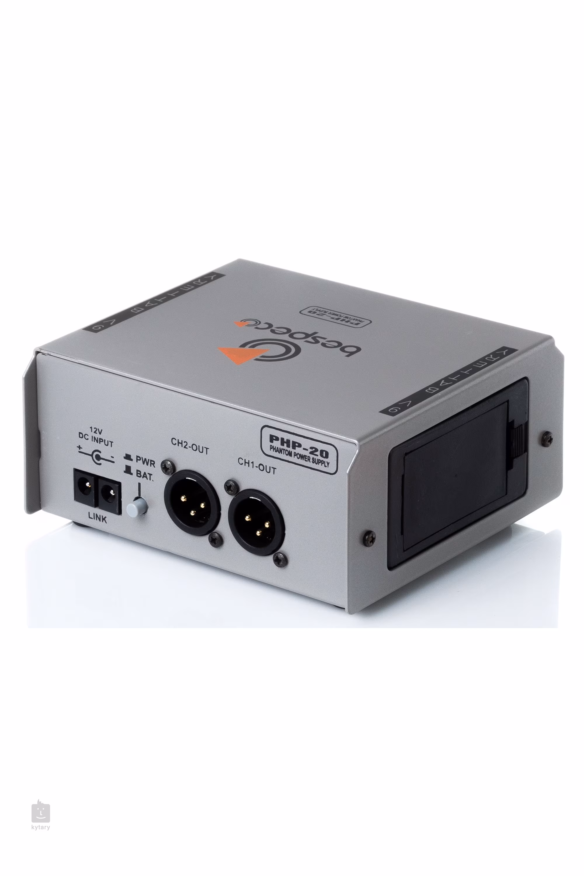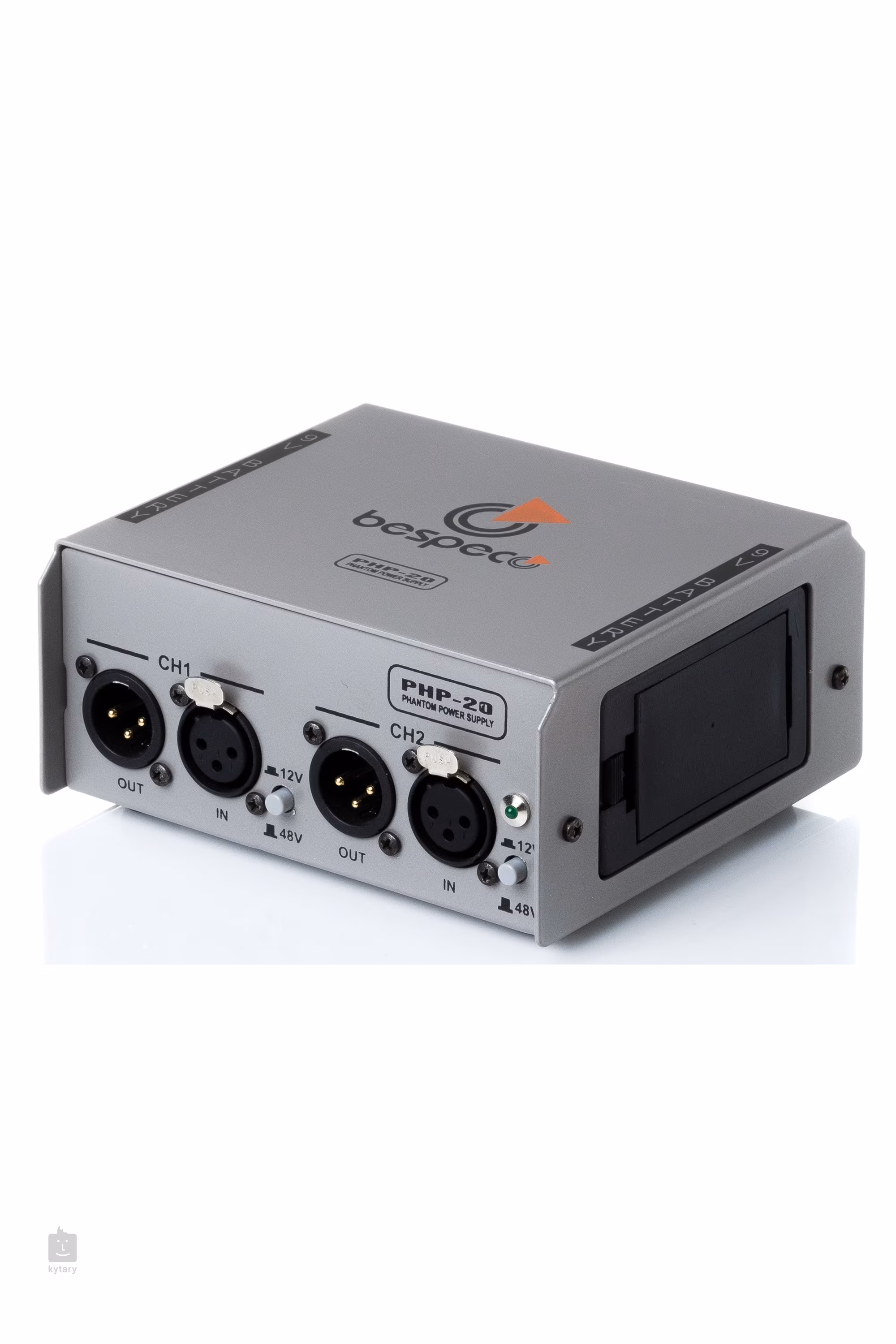 Bespeco PHP20 je dvoukanálové phantom napájení kondenzátorových mikrofonů nebo jiných přístrojů. Disponuje přepínačem napětí od 12 do 48 V. Lze ho napájet dvěma devítivoltovými bateriemi nebo 12 V adaptérem (není součástí balení).
