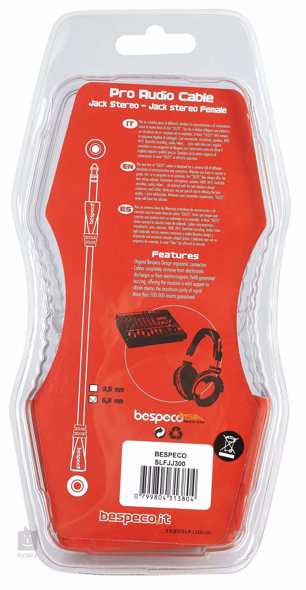 Prodlužovací kabel na sluchátka. Tento kabel ze série Bespeco Silos disponuje vodičem z 98% bezkyslíkaté mědi (OFC) a vnitřním polovodivým PVC pláštěm, díky němuž neprodukuje žádný šum. Ke kvalitě zvuku přispívá i spirálové stínění na více jak 92 procentech vodiče nebo lité plastové konektory. Samozřejmostí je odolné a zároveň flexibilní opláštění z PVC a vulkanizovaného silikonu. Kabely z této série se hodí k celé řadě aplikací a překvapí výbornou kvalitou a velice příjemnou cenou.