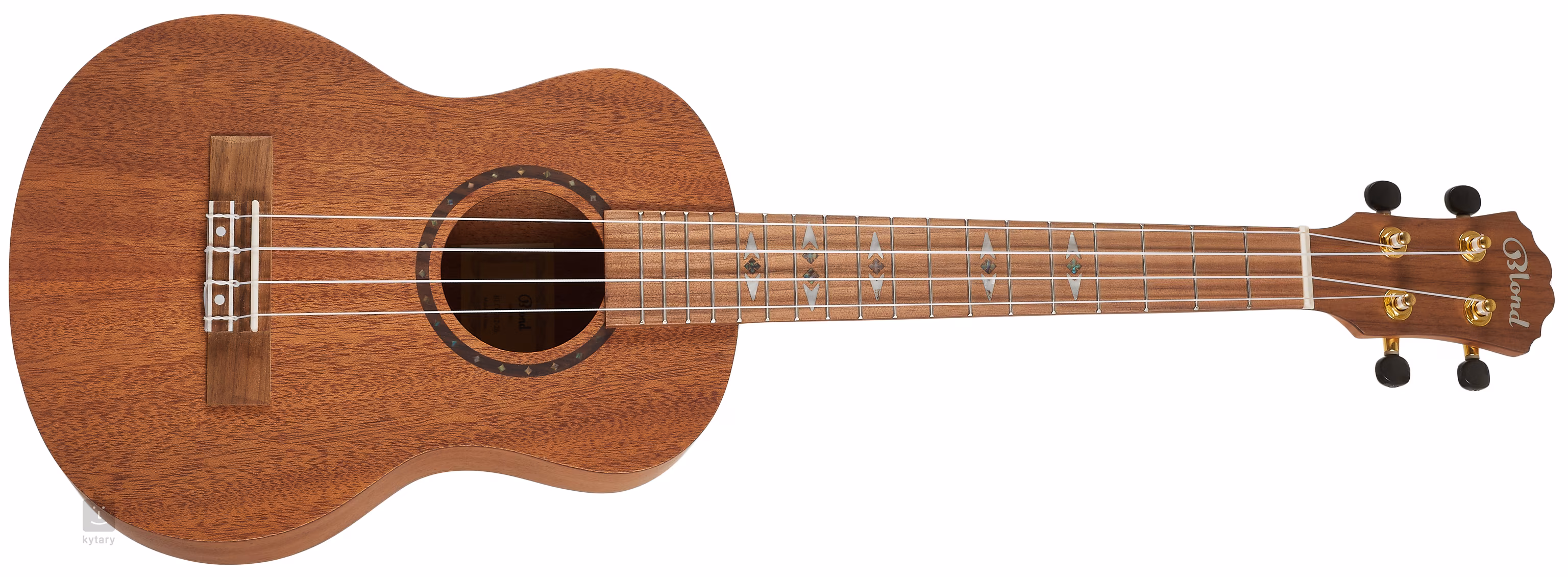 Tělo tenorového ukulele Blond BLO-032-26 je zhotoveno z mahagonu - přední deska z masivu, zadní deska a luby z laminovaného mahagonu. Hmatník z černého ořechu je osazen osmnácti pražci, ze stejného materiálu je i kobylka ukulele.