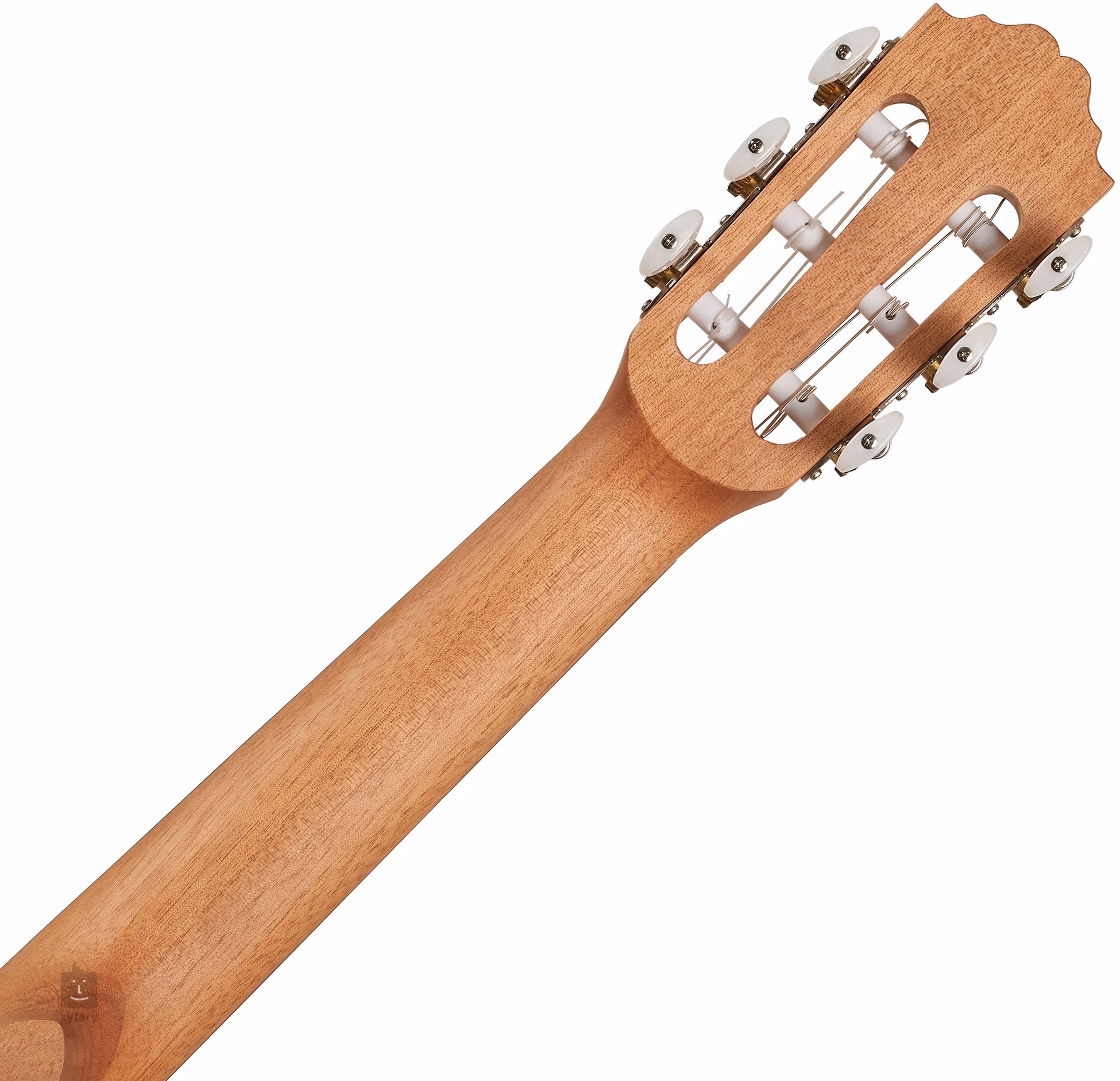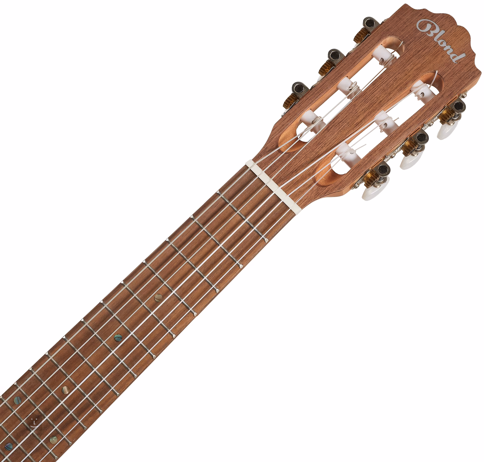 Akustické kytarové ukulele Blond BLO-064-28 nabízí přední desku z masivu smrku, zadní desku a luby z laminovaného mahagonu a hmatník a kobylku z černého ořechu.