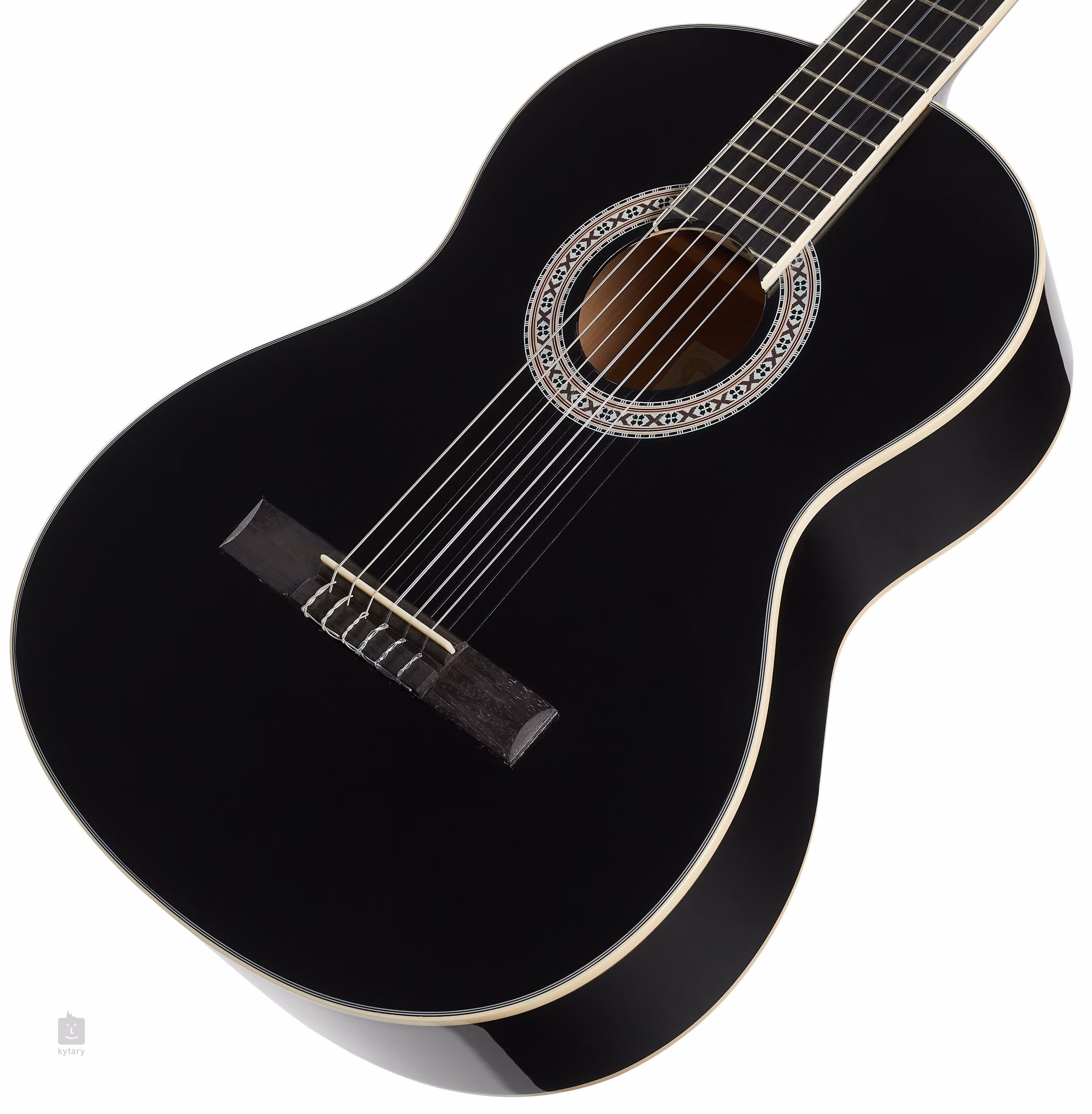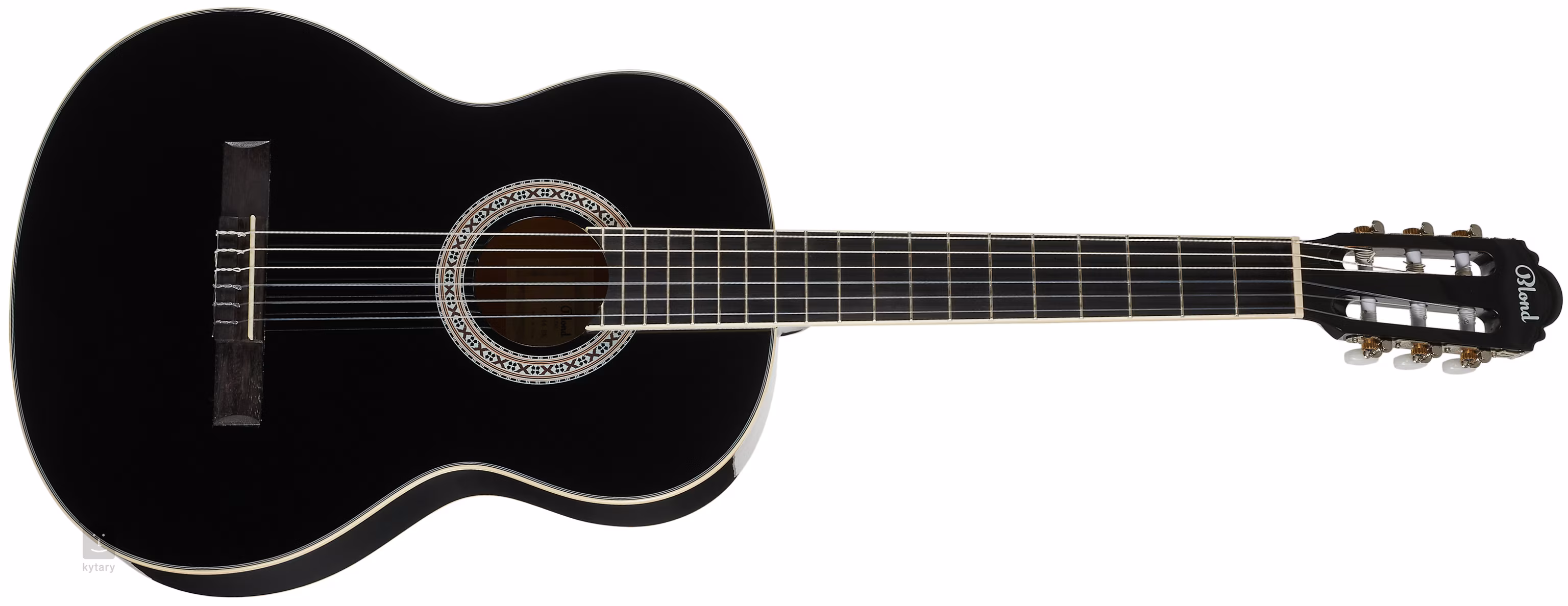 Klasická kytara Blond OC-44 BK v 4/4 velikosti nabízí tělo zhotovené z vrstveného smrku a lípy, krk ze dřeva okoumé a hmatník a kobylku z moderního kompozitního materiálu. Struny jsou přes plastový nultý pražec uchyceny v klasických chromovaných mechanikách s bílými kolíčky. Stylové zpracování podtrhuje nanesený lesklý lak, černá úprava přední desky a tradiční prvky v podobě dekorativní rozety a plastové lemovky (ABS).