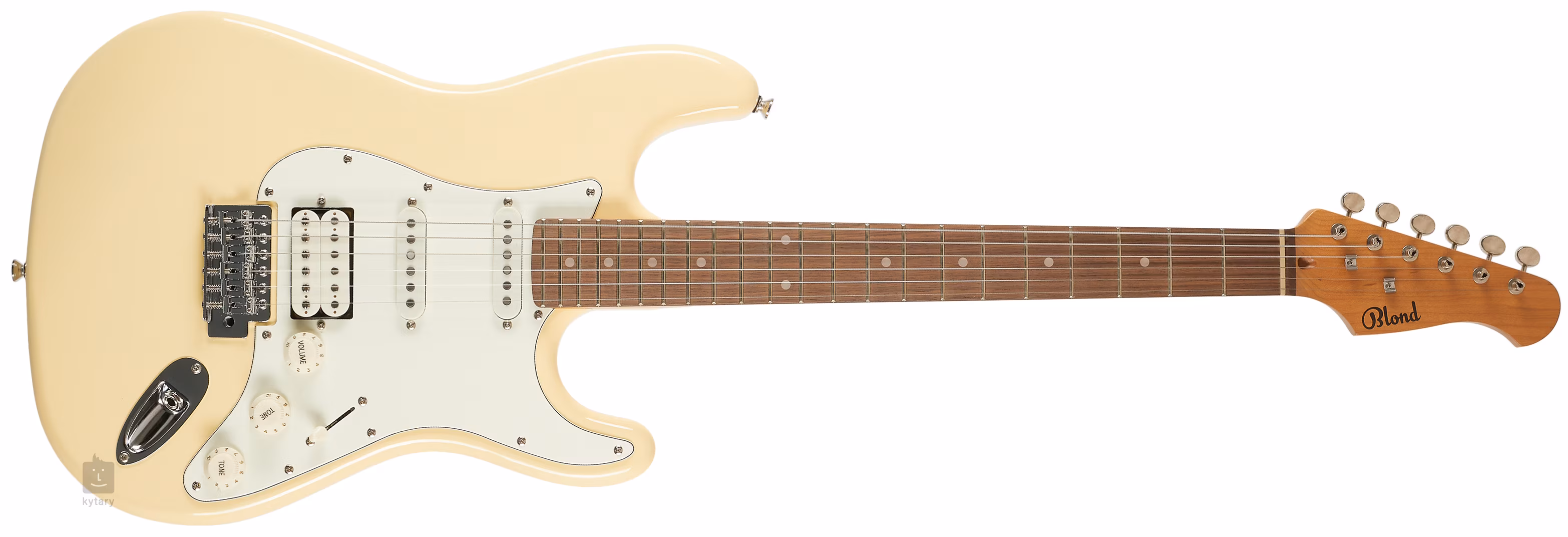 Elektrická kytara Blond STR-2H VW z řady Standard Series představuje ideální volbu pro začínající rockery a rockerky. Jedná se o nástroj s tradičním ST tvarem a všemi náležitostmi, které si s tímto typem kytary spojíte - od snímačů přes synchronizované tremolo po pickguard. Tělo kytary je zhotoveno z lípy. K javorovému krku je přilepen hmatník z fíkovníku osazený dvaadvaceti pražci. Díky tepelné úpravě krku (caramelized maple) je dřevo stabilnější a zároveň získá příjemně nazlátlou barvu již roky hraných nástrojů. Kombinace kobylkového humbuckeru a dvou single-coil ST style snímačů s Alnico V magnety poskytuje kytaře jak klasické čisté tóny a drive/crunch single-coilů, tak i plný rockový zvuk humbuckerů. Jeho charakter upravíte pomocí ovladačů tónové clony, hlasitosti a pětipolohového přepínače snímačů. Struny jsou uchyceny ve firemních ladicích mechanikách a synchronizovaném tremolu. Stylové zpracování podtrhuje krémový pickguard (parchment) a chromovaný hardware.