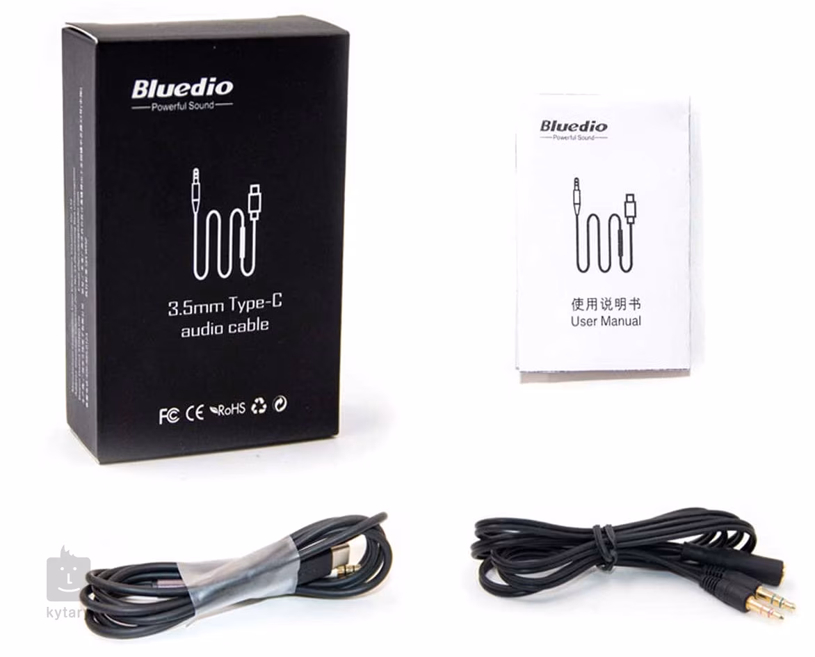 Propojovací USB-C to jack 3,5 mm TRS kabel je kompatibilní se všemi sluchátky Bluedio s USB-C konektorem. Součástí balení je i Y-type adapter / splitter kabel 2x jack 3,5 mm TRS (M) to jack 3,5 mm TRS (F).