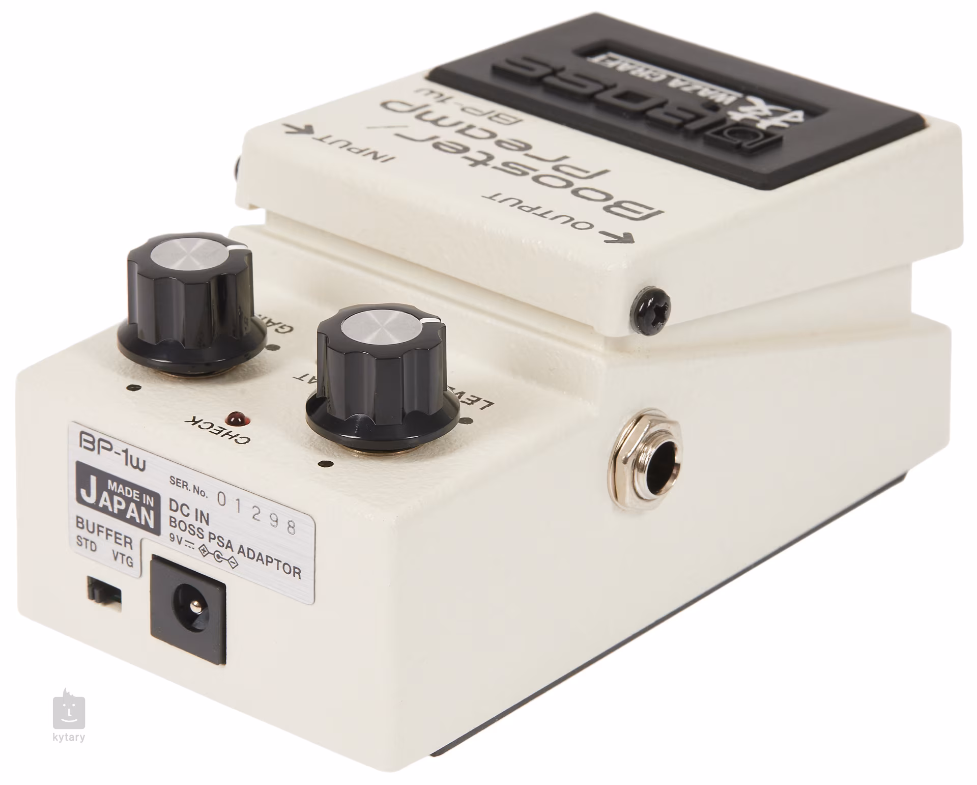Standardními ovladači upravíte míru saturace a výstupní hlasitost, přepínačem vstupního bufferu můžete volit mezi standardním bufferem (Standard) a vintage bufferem s nižší vstupní impedancí (Vintage). K napájení pedálového efektu Boss BP-1W je zapotřebí 9V baterie nebo 9V adaptér (adaptér není součástí balení).