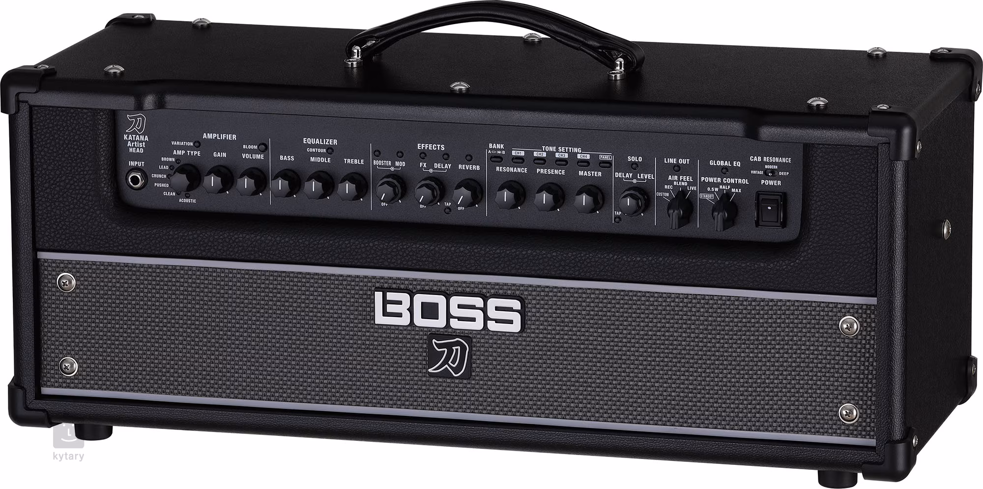 Boss Katana Artist Head Gen 3 je kytarový hybridní zesilovač s výkonem 100 wattů. Díky funkci Power Control (100W, 50W, 0,5W) si můžete užívat „nakopnutý“ zvuk a odezvu aparátu i při pokojové hlasitosti. V rámci široké palety aparátových zvuků si snadno najdete ten svůj – ať už vás více oslovují oldies retro tóny, modernější hi-gain nebo hledáte zvuk optimalizovaný pro elektroakustické kytary. Efektová jednotka nabízí v pěti kategoriích (Booster, Mod, FX, Delay, Reverb) celkem patnáct efektů, kdy všech pět efektových skupin můžete používat simultánně a plně tak nahradit krabičky v pedalboardu. Připojením k software BOSS Tone Studio lze zajít ještě dále - sekce si můžete přizpůsobit pomocí více než 60 různých typů efektů, měnit pořadí efektů v řetězcích a mnohem více.