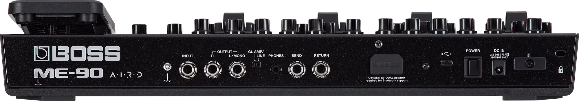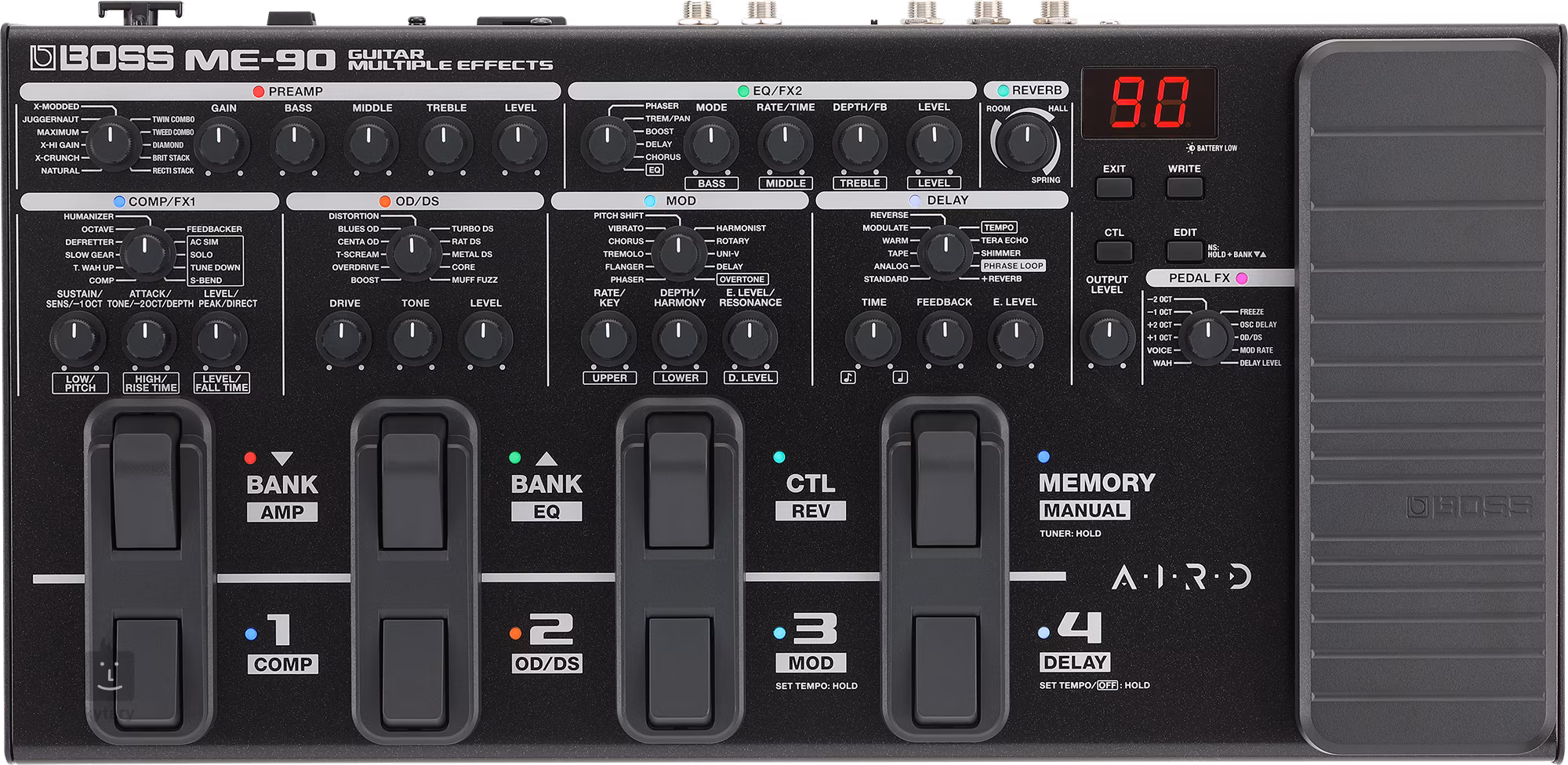 Kytarový multiefekt BOSS ME-90 představuje dosud nejpokročilejší model z letité řady BOSS ME. Nabízí výjimečnou kvalitu zvuku díky 24bitovým AD/DA převodníkům, 32bitovému procesoru (floating point) a vzorkovací frekvenci 48 kHz, 11 vestavěných modelů zesilovačů AIRD a 60 různých efektů odvozených od vlajkové lodi BOSS GT-1000, IR loading, efektovou smyčku, snadné vytváření zvuků ve stylu pedálových efektů s intuitivním rozhraním, speciální sekci zesilovačů a sedm efektových bloků, které lze používat simultánně, osm multifunkčních nožních spínačů, nově přepracovaný expression pedál, 36 přednastavených presetů/patchů a 36 uživatelských presetů/patchů pro uložení vlastních nastavení.