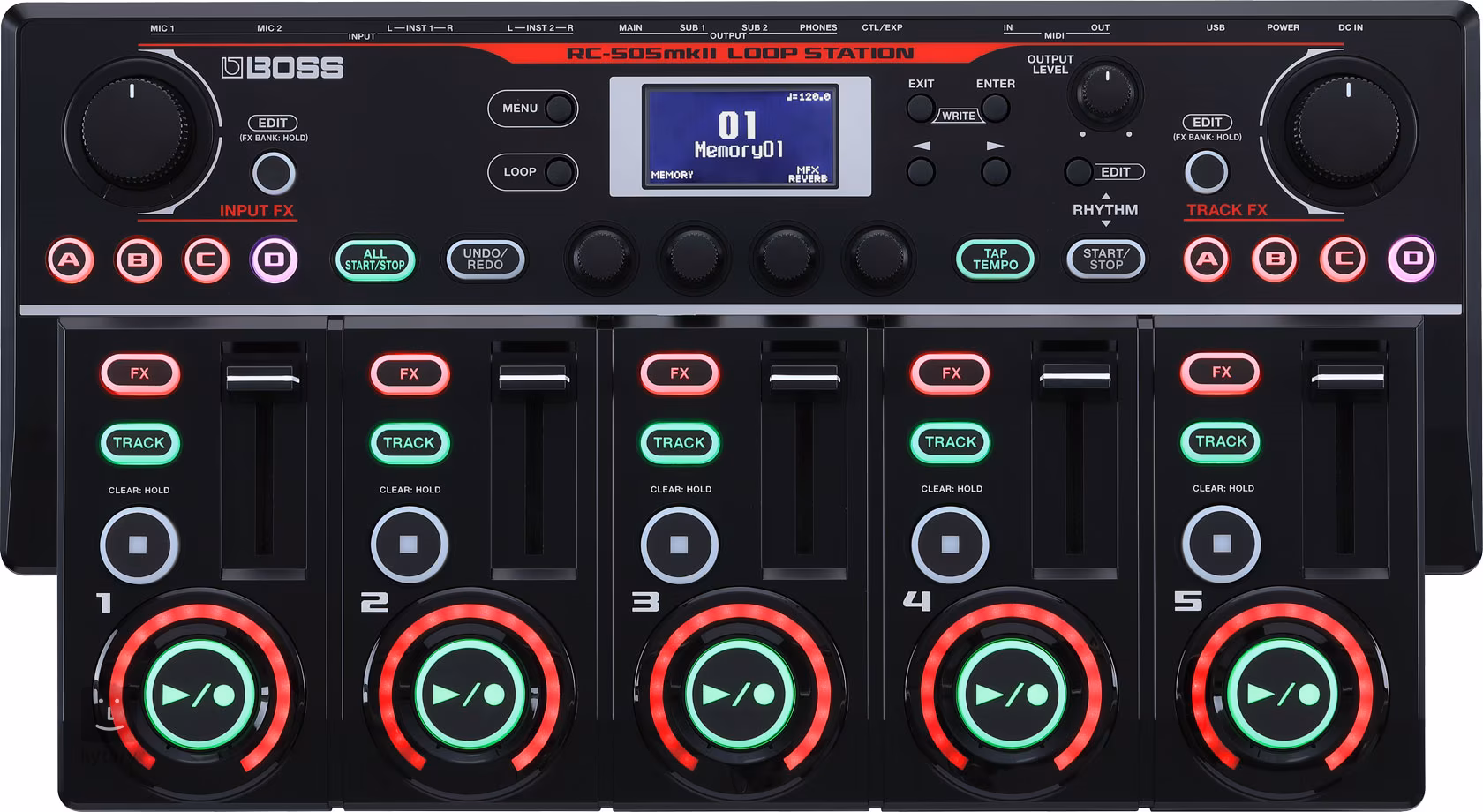 RC 505 druhé generace je inteligentní, vysoce promyšlený looper určený pro zpěváky, DJe a další hudebníky. Jde o kompaktní zařízení, které můžete mít vždy po ruce a snadno pracovat s jeho pěti stereo stopami smyček a zabudovanými efekty. Stačí zapojit mikrofon, libovolný hudební nástroj nebo jiný zdroj zvuk a pak si jen intuitivně hrát se smyčkami. Samozřejmostí je USB rozhraní pro propojení s počítačem, možnost připojení ovládacích pedálů a MIDI rozhraní. Pro mikrofon je zde i předzesilovač s phantomovým napájením. Druhá generace oblíbeného stolního looperu přináší nové typy efektů a možnost využívat efekty v sekcích Input FX i Track FX současně. Vylepšení se dočkaly také funkce pro ovládání looperu prostřednictvím externích kontrolérů, což ocení zejména kytaristé a hráči na klávesové nástroje, kteří musí ovládat svoje smyčky nohou. Rozšíření se dočkal i zadní panel s konektory, nyní zde naleznete dva mikrofonní vstupy, dva nástrojové stereo vstupy, dva vstupy pro expression pedály a tři stereo linkové výstupy pro možnost zapojení do třech různých cílových zařízení. Tento looper má paměť až pro 99 slotů, každý z nich může obsahovat 5 frází a nastavení efektů, zároveň nabízí 85 rytmických patternů. Jednotlivé smyčky v rámci zmíněných 5 frází lze používat zvlášť nebo najednou, nechybí možnost overdub, tedy jejich vrstvení. Každý smyčka má vlastní fader pro nastavení hlasitosti, vlastní mód přehrávání a synchronizaci tempa. Zabudovaná efektová jednotka obsahuje všechny potřebné efekty, velká část je věnována vocoderům, efektům pracujícím s dynamikou, sampler efektům a dalším filtrům, patří sem i delay, EQ, compressor, chorus, reverb, octaver a další. Pro celkový zvuk jsou zde compressor a reverb. Nastavení lze samozřejmě ukládat do presetů. Pokud jde o vstupní rozhraní, lze použít dva XLR mikrofonní vstupy, mono či stereo 6,3mm Jack vstupy pro kytary, klávesy, syntezátory a 3,5mm Jack pro zařízení typu CD nebo mp3 přehrávačů. USB rozhraní umožňuje ukládat nahrané smyčky do počítače či je z něj nahrávat do looperu. Jak USB, tak MIDI rozhraní lze použít ve spolupráci s DAW software při nahrávání.
