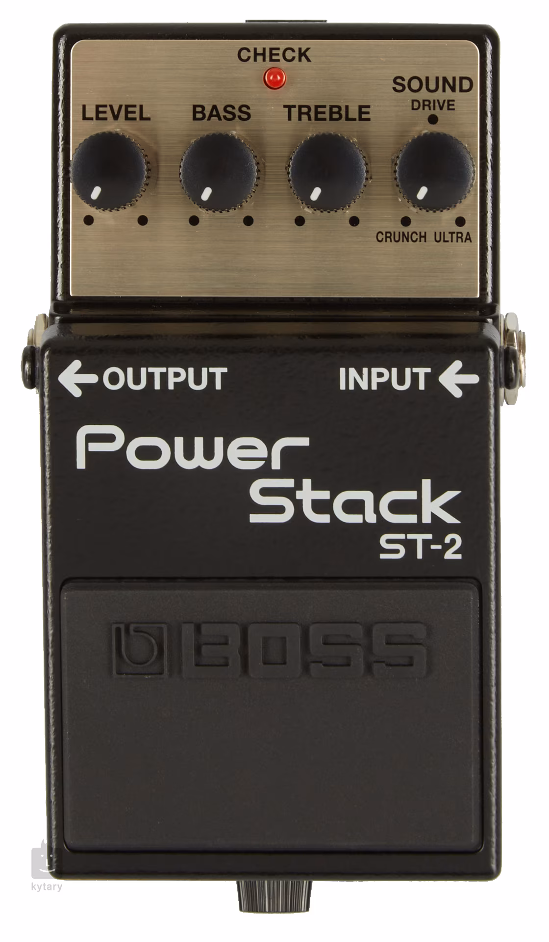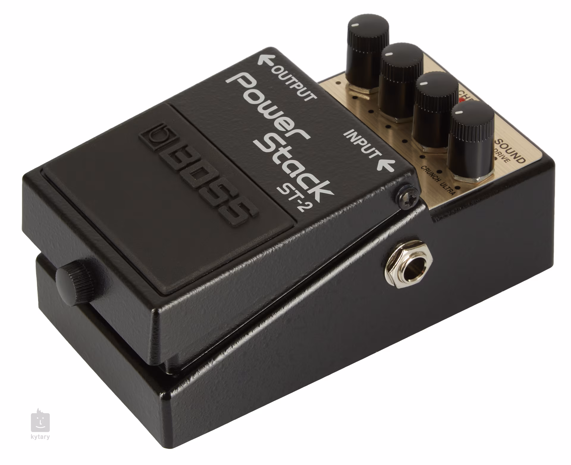 Boss ST-2 Power Stack nabízí autentický zvuk kytarového stacku (zesilovače a boxu) v kompaktním těle pedálového efektu. tj. to, o co se pokouší mnohé současné amp-in-box krabičky. Ovladačem Sound nastavíte zvuk kytary v rozmezí od klasického blues/rockového crunche přes plný rockový overdrive po hutný metalový distortion s parádním sustainem. Pedál i při vysokém zkreslení uchovává čitelnost zvuku a perfektní dynamickou odezvu na detaily vaší hry a změny hlasitosti. Zbylé ovladače efektu určují barvu tónu (dvoupásmové EQ Bass a Treble) a výstupní hlasitost (Level).