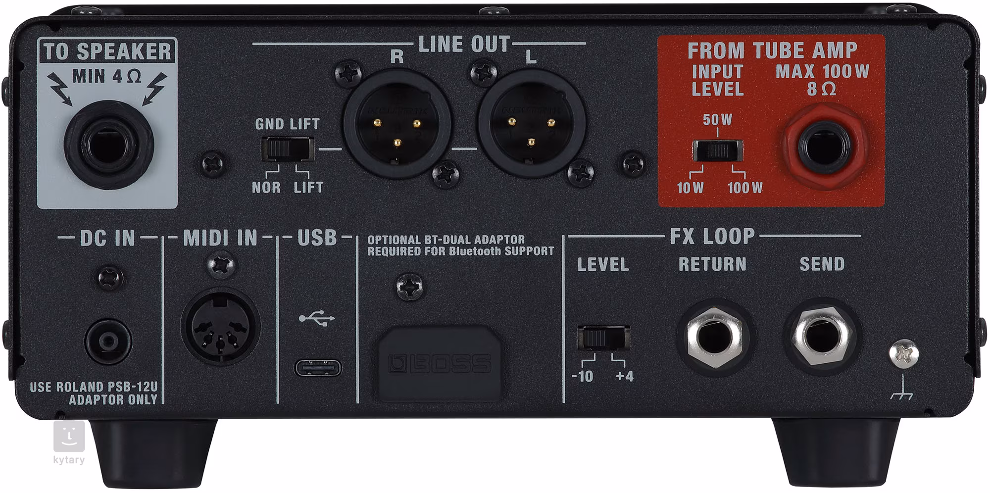 Na zadním panelu najdete vstup pro lampový zesilovač o impedanci 8 Ω a maximálním výkonu 100 W, výstup do reproboxu o minimální impedanci 4 Ω a dva XLR výstupy (L, R) pro připojení k nahrávacímu zařízení. Nechybí zde také konektory pro integraci externí efektové smyčky (Send, Return), USB rozhraní pro přímé nahrávání s DAW nebo připojení k editačnímu softwaru, vstup pro MIDI a slot pro BT-DUAL adaptor (není součástí balení), který umožňuje Bluetooth připojení. K napájení zařízení slouží výhradně adaptér Roland PSB-12U, který je součástí balení.
