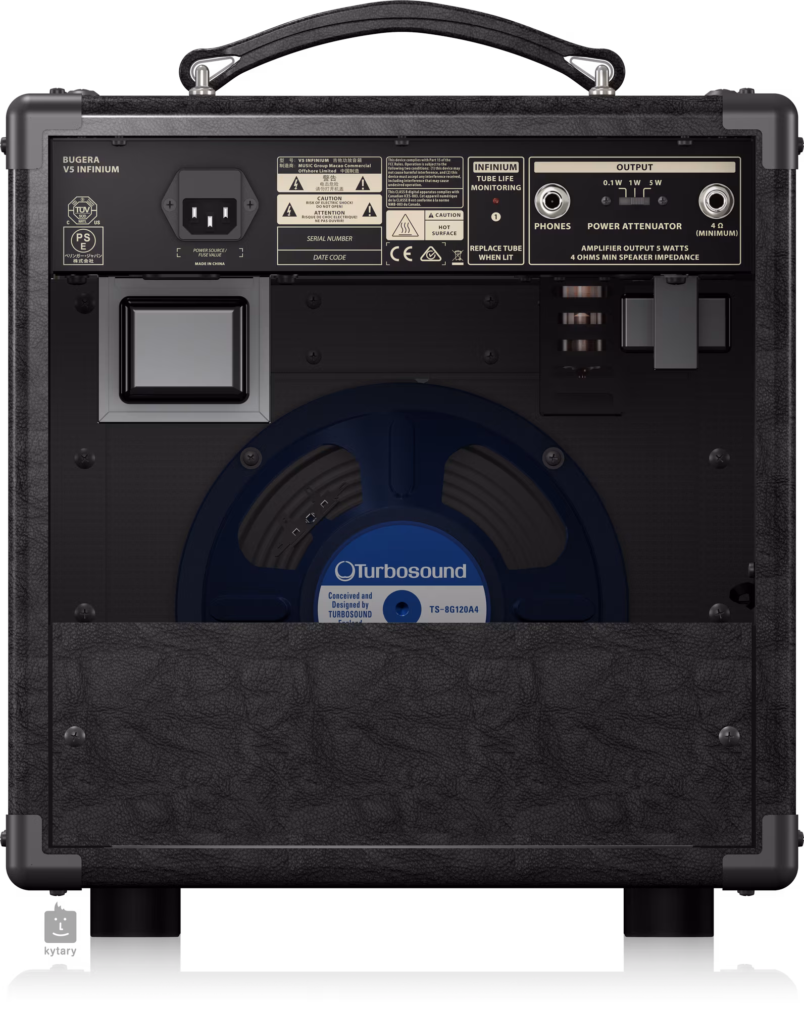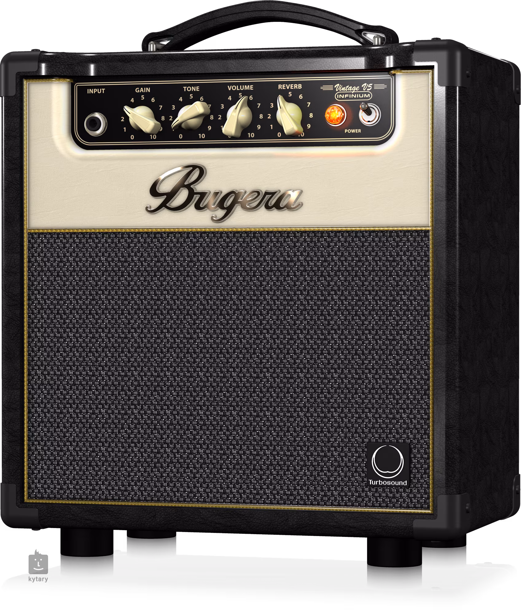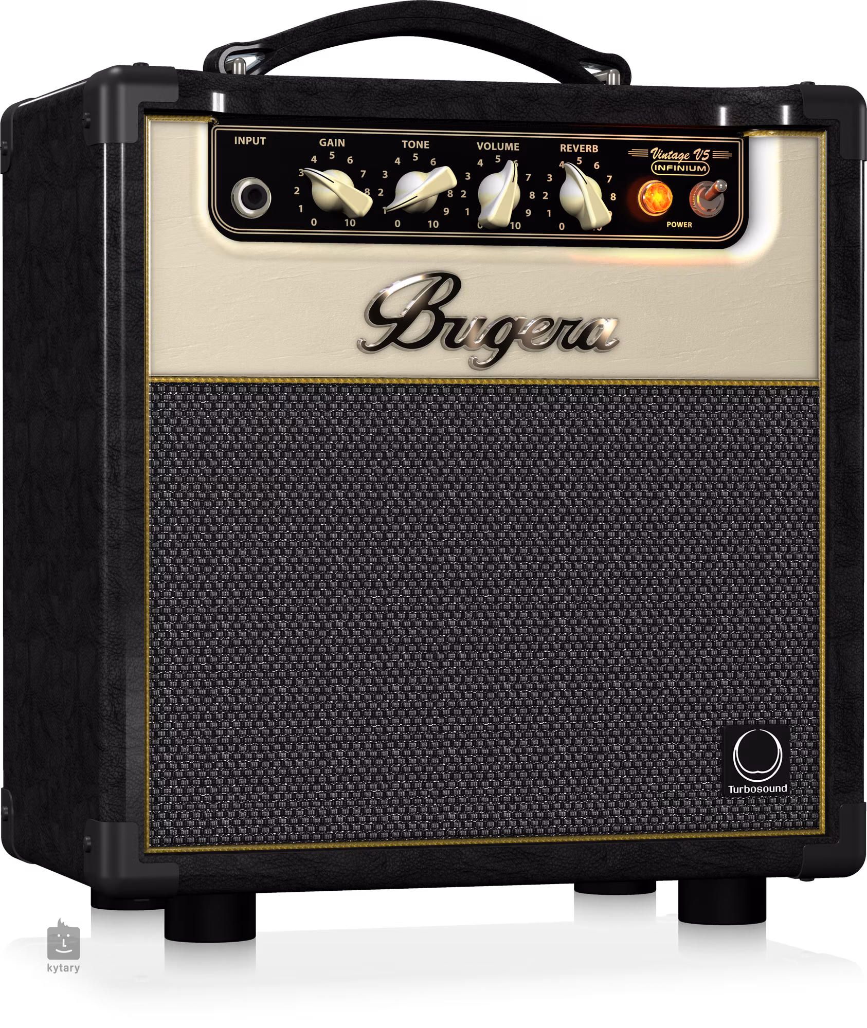 Bugera V5 INFINIUM je kompaktní jednokanálové lampové kytarové kombo s přepínatelným výkonem (5, 1, 0,1 W) vhodné pro domácí cvičení, případně jako clean amp pro nahrávání. Vintage design komba podporuje i vintage “sound”, kdy vám poskytne jak krásně čistý zvuk, tak i blues/rockový crunch. Kombo dále nabízí vestavěný efekt reverb, sluchátkový výstup a výstup do externího reproboxu s minimální impedancí 4 ohmy. Použitá technologie INFINIUM Tube Life Multiplier Technology prodlužuje až dvacetinásobně životnost koncových elektronek.