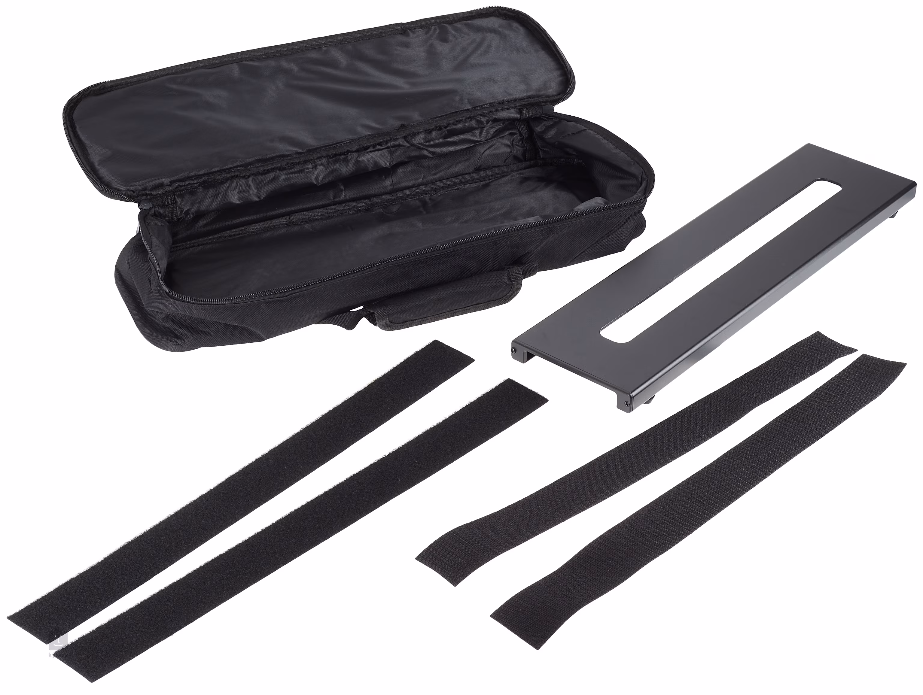 CB-107 je jednoduchý jednořadý pedalboard, na jehož plochu vměstnáte až šest propojených mini pedálů (např. řady Caline AP). Pedalboard je dodáván v přenosném polstrovaném obalu spolu s páskou Velcro, tj. suchým zipem pro připevnění krabiček (výrobce neuvádí délku pásky).