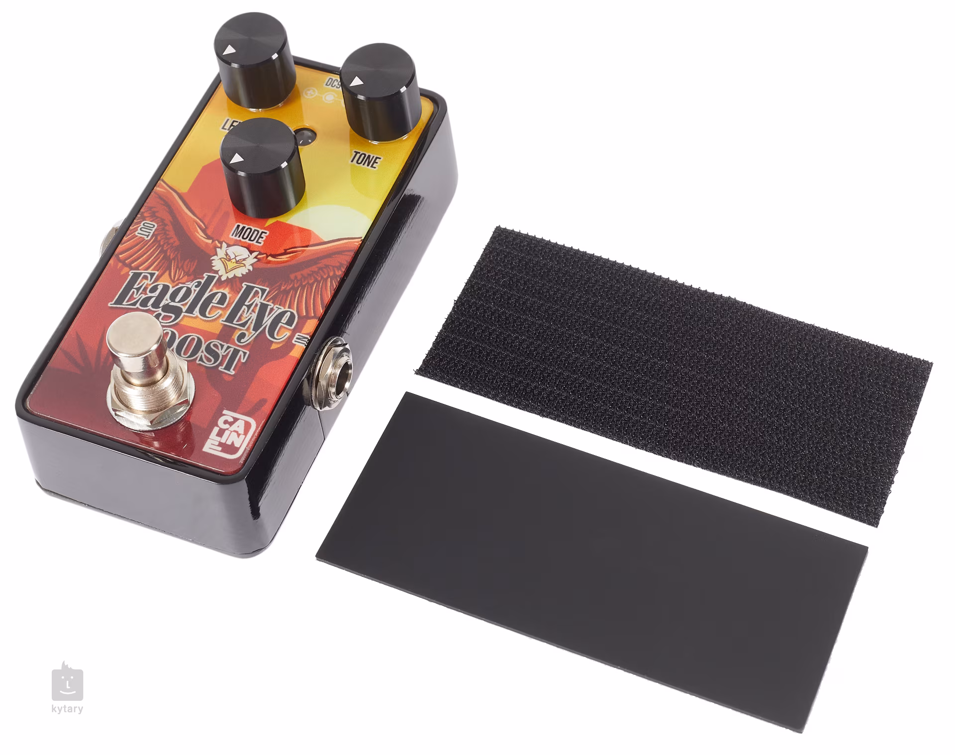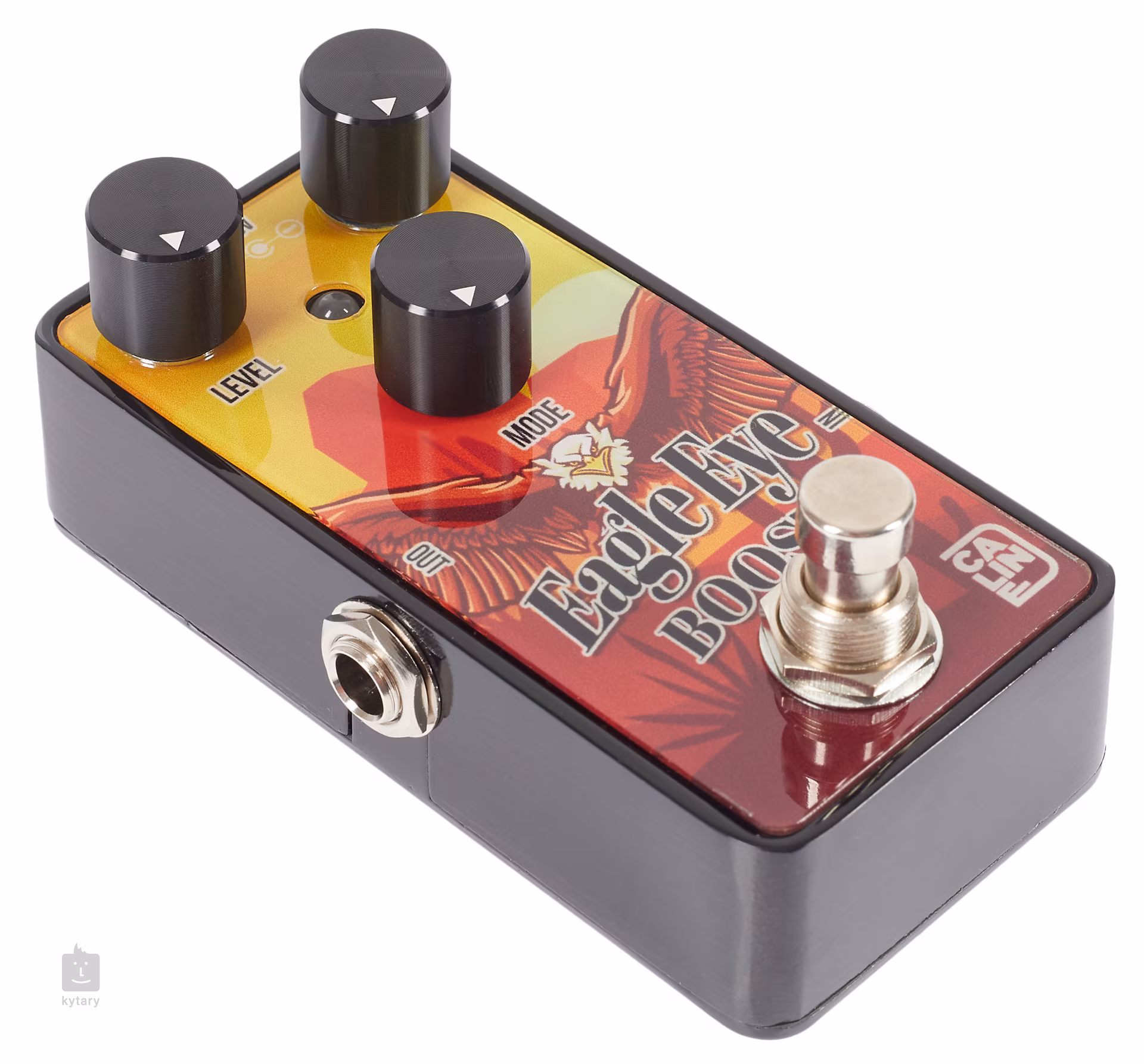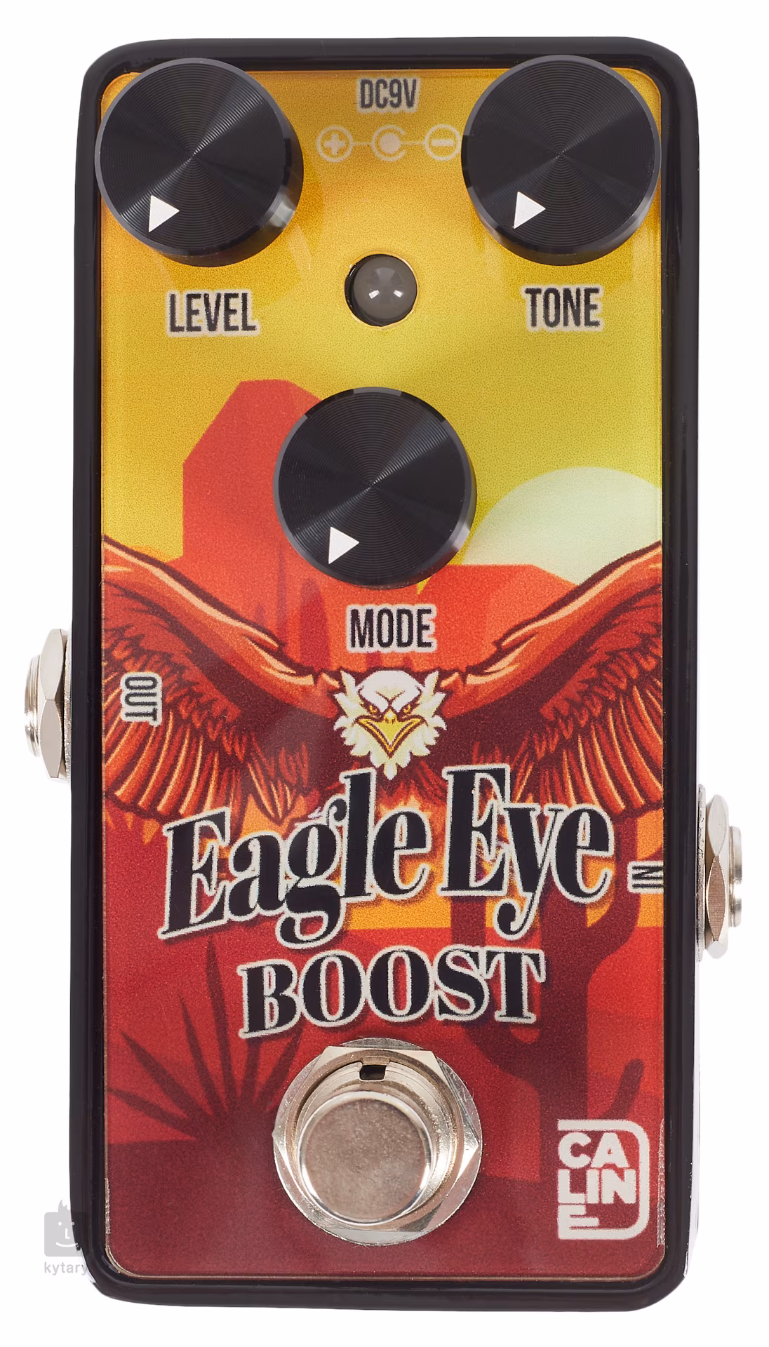 Eagle Eye Boost je kompaktní pedálový booster z řady G Series značky Caline. Nabízí pětipolohový knob Mode, kterým nastavíte odezvu ve středových frekvencích (mid-boost). Ovladači Level a Tone upravíte výstupní hlasitost a barvu tónu (basy, výšky). Pedálový efekt je zapojen jako true-bypass, takže ve vypnutém stavu neovlivňuje průchozí signál. K napájení slouží 9V adaptér (není součástí balení). Odběr krabičky odpovídá 50mA.