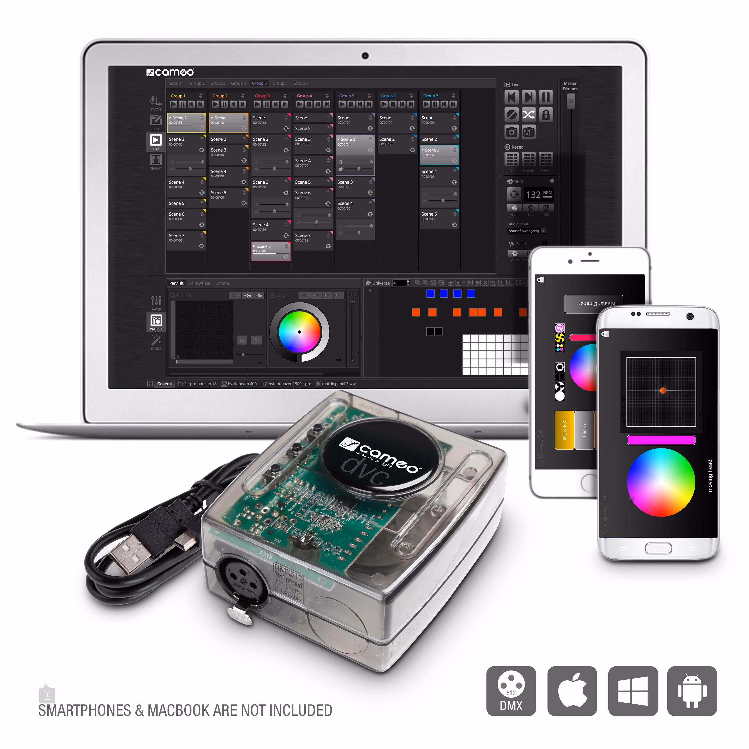 Cameo DVC 4 vám umožňí řídit jakékoli zařízení kompatibilní s DMX a to pomocí softwaru Cameo D 4 z počítače nebo Macu. Rozhraní Plug & Play poskytuje 512 DMX kanálů v živém režimu a obsahuje interní paměť pro 256 kanálů v samostatném režimu. To vám umožní zkopírovat programování světelného přehledu do jednotky a spustit jej bez počítače. Díky vstupu mini-USB a 3 pin výstupu DMX je DVC 4 napájen z USB portu počítače. Tři ovládací tlačítka umožňují volbu programu a stmívání v samostatném režimu, který vyžaduje standardní napájecí adaptér 5V USB.