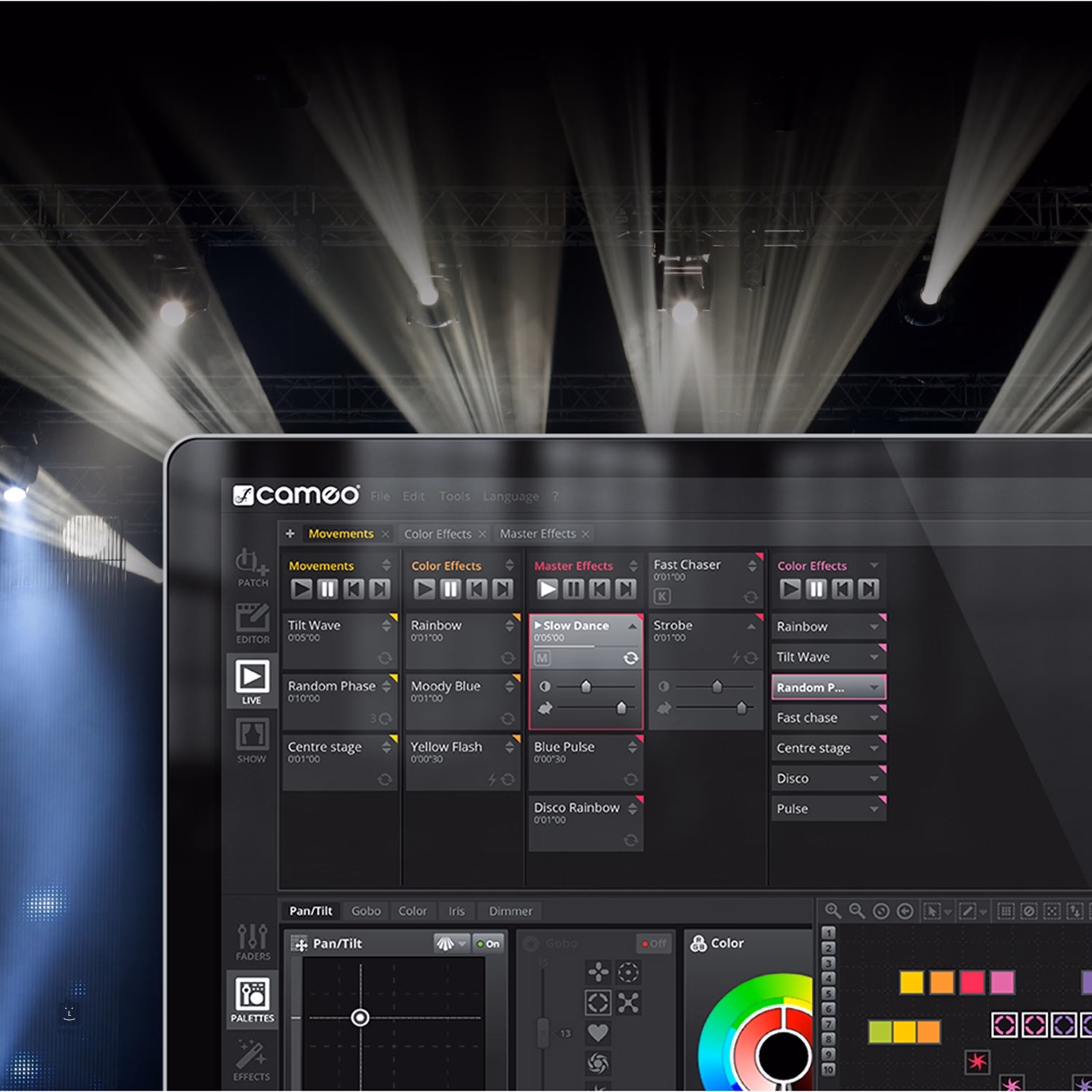 Bezplatný softwarový balík Cameo D 4 obsahuje více než 15 000 továrních presetů a editor pro vytváření uživatelských nastavení. Umožňuje mapovat jednotlivé typy sestav, seskupovat je a vytvářet hlavní rozvržení v 2D zobrazení. Vytvořte, uspořádejte a ukládejte dynamické scény, použijte integrované palety pro ovládání světla bez nutnosti pohybu faderů a generujte stovky vzrušujících efektů s motorem XEEL.