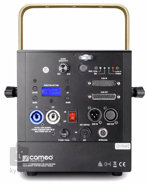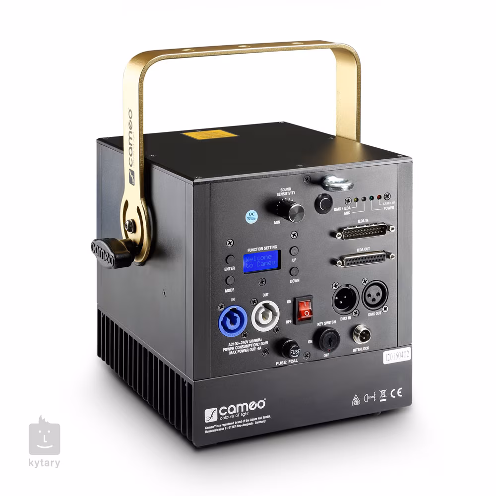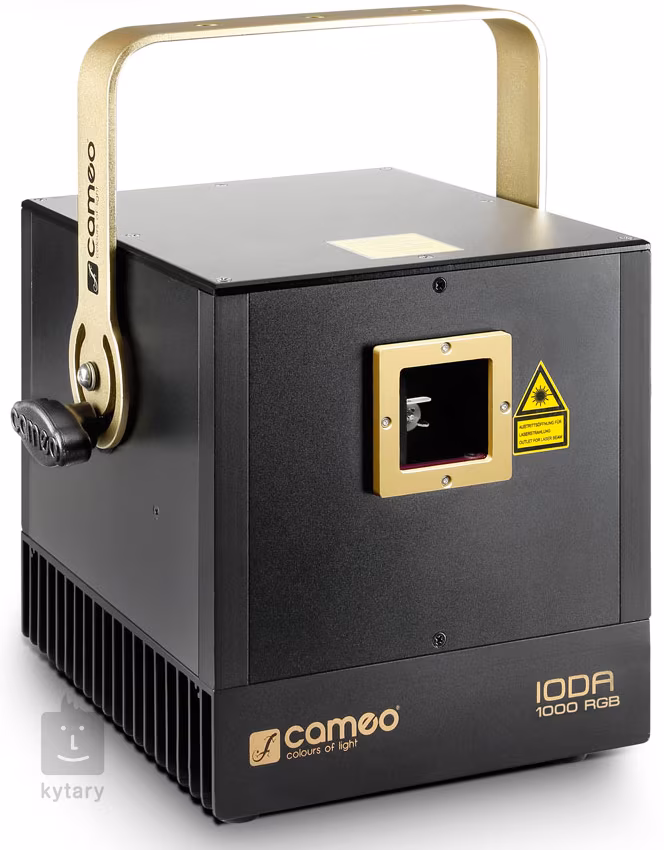 Profesionální laser s barevným spektrem RGB (červená, zelená, modrá), 3 mm paprsky, odchylkou max. 1,5 mrad, rozhraním ILDA a výkonem 1000 mW.
