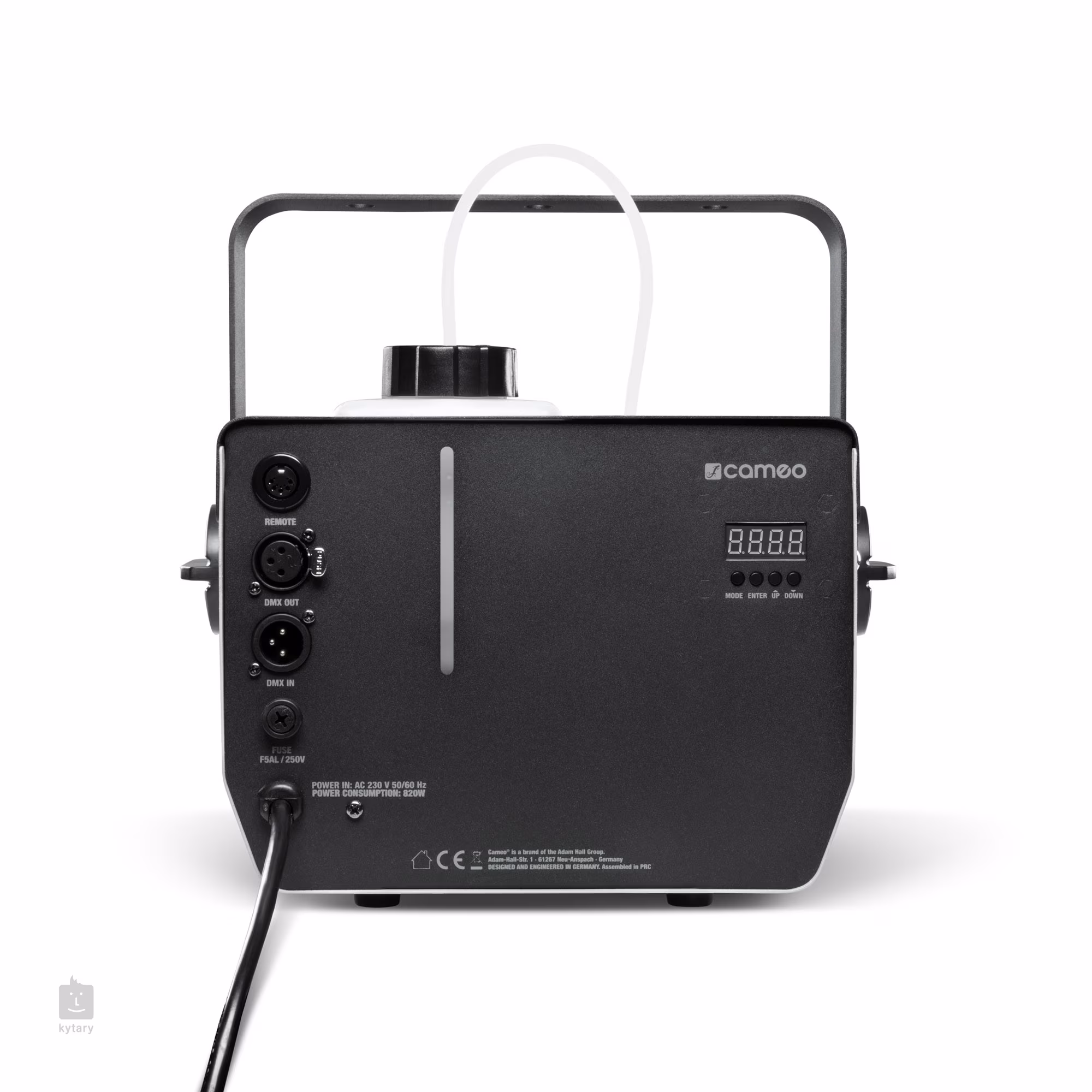 K ovládání zařízení vám poslouží přehledný LED displej se čtyřmi tlačítky, dálkový ovladač, který je k hazeru připojen 10m kabelem nebo standardní DMX protokol se 2 kanály – k tomuto účelu je přístroj osazen 3pinovými DMX konektory. Zásobník na kapalinu je podsvícen, abyste jeho stav mohli monitorovat i v tmavém prostředí. Kapacita zásobníku je 800 ml.