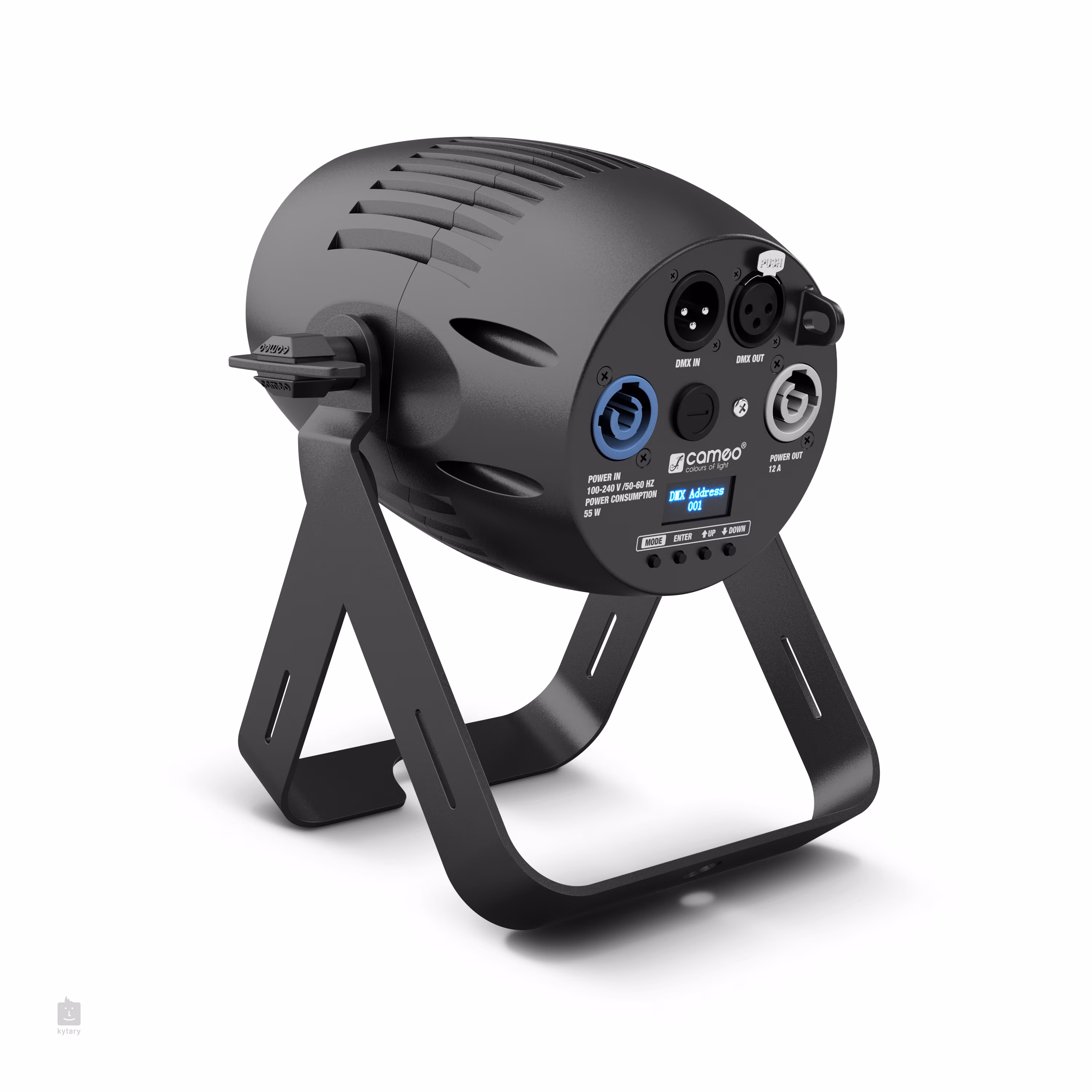 Zařízení lze ovládat prostřednictvím protokolu DMX nebo RDM. Dále můžete využít ovládání s pomocí Master/Slave, standalone nebo zvukové ovládání prostřednictvím integrovaného mikrofonu. Zadní panel nabízí 3pinové DMX In/Out konektory a napájecí konektory PowerCon In/Out pro napájení a daisychain připojení. Dále zde naleznete přehledný OLED displej a čtyřtlačítkový ovládací panel. Zařízení má základní IP krytí IP20, takže je vhodné pouze pro použití ve vnitřních prostorách. K reflektoru lze dokoupit dálkový IR ovladač.