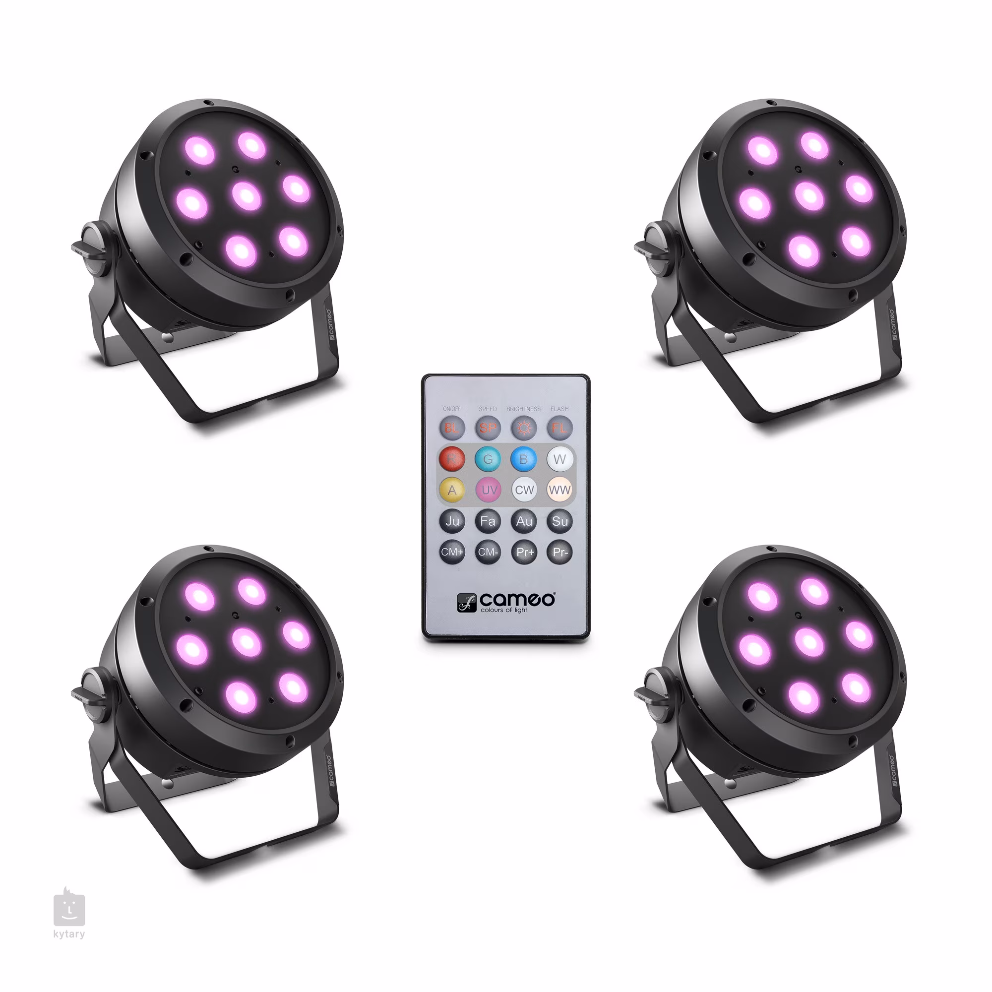 Sada čtyř LED PAR reflektorů Cameo ROOT PAR 4 BK a dálkového IR ovladače. Sestava je vhodná pro osvícení klubových koncertů, firemních eventů a jiných menších akcí.
