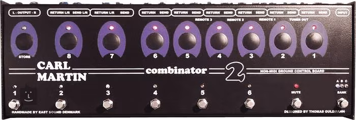 Do Combinatoru 2 lze zapojit efekty až do 8 smyček. Prvních šest je mono, poslední dvě lze použít i stereo. První 3 smyčky mají také klasický 6,3 jack výstup pro přepínání jiných zařízení, mohou tak sloužit např. jako footswitch u Vašeho aparátu. Programování tohoto nožního spínače je jednoduché – zapojte efekty do smyček, zvolte banku pomocí kovového spínače (signalizováno červenou LED diodou), pomocí spínačů s gumovými kryty umístěnými pod vstupy a výstupy smyček zvolte které smyčky mají být aktivní (také signalizováno červenou LED diodou) a stisknětě spínač Store – a vše je hotovo. Kombinace smyček, potažmo efektů, lze uložit do 18 bank. Spínač úplně vpravo přepíná mezi 3 skupinami, u každé z nich lze jinak nastavit příslušné smyčky k 6 bankách ovládaných zbylými kovovými spínači.