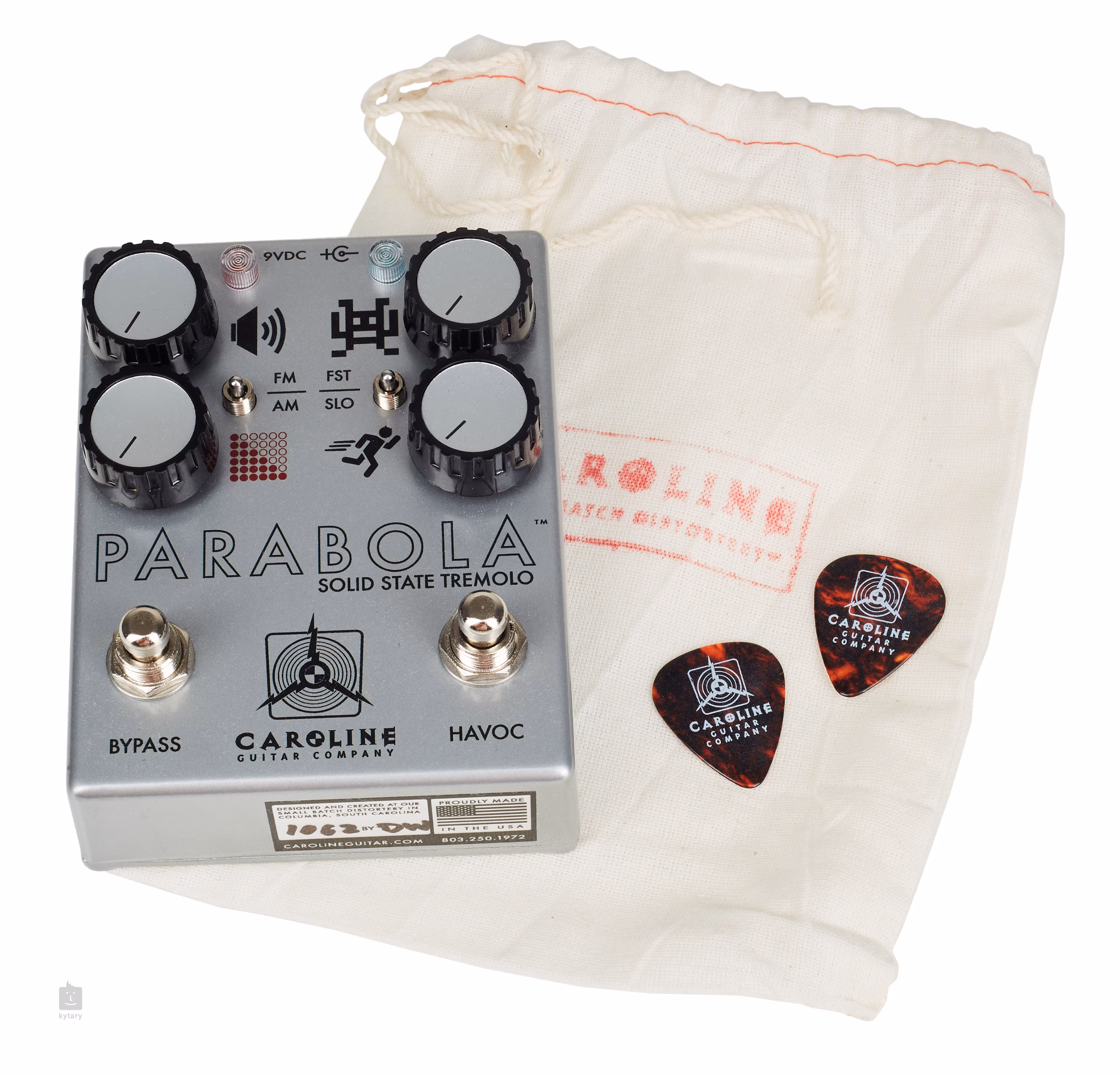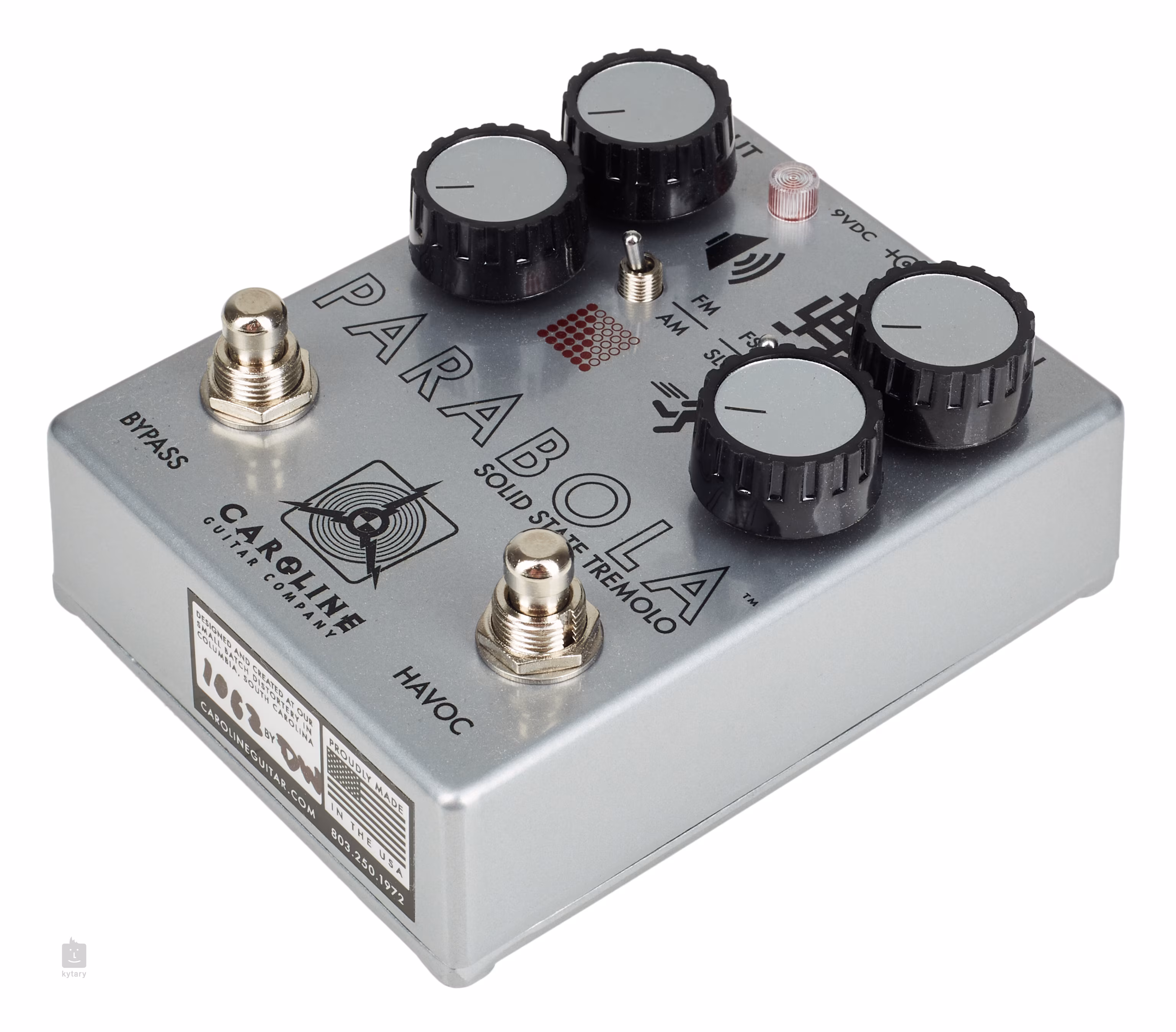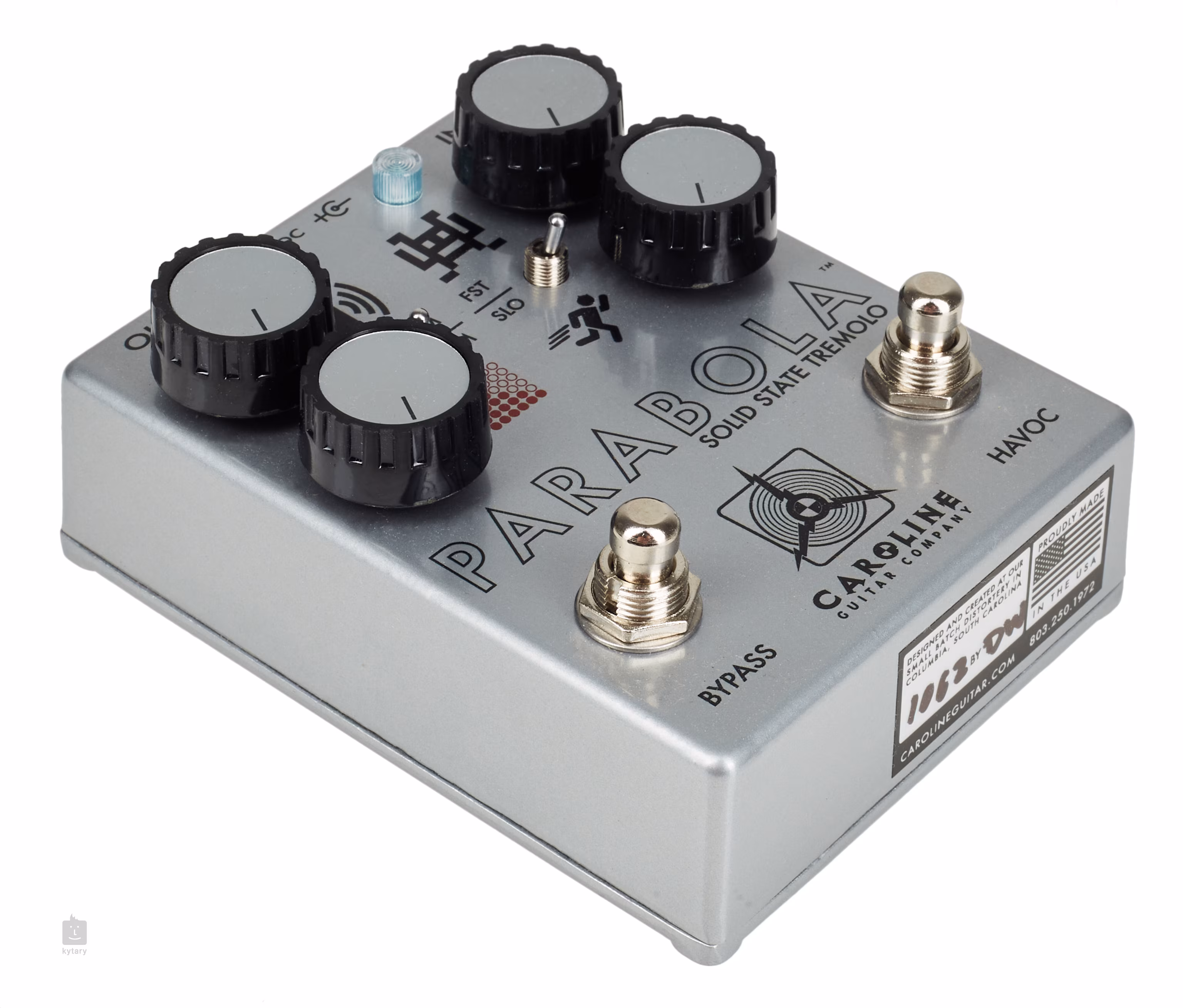 Caroline PARABOLA Solid State Tremolo je tremolo efekt inspirovaný nejmenovaným “západoněmeckým” zařízením. S touto krabičkou budete vytvářet zcela nová úžasné modulované zvuky. Nastavení jednotlivých ovladačů určuje charakter zvuku v první úrovni preampu (Gain), rychlost a šíři pásma LFO (Speed, Range), intenzitu modulace a tvar zvukové křivky (Depth), hlasitost výstupního signálu a voicing tremolo efektu (amplitude mod nebo filter mod). Druhý footswitch (Havoc) maximalizuje rychlost a intenzitu modulace.