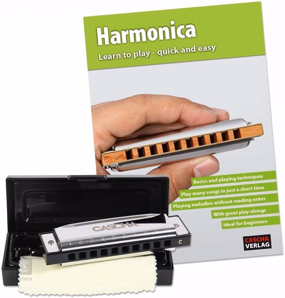 Součástí setu Cascha Blues Set je diatonická foukací harmonika laděná v C dur, plastová krabička na harmoniku, čistící hadřík a čtyřjazyčná škola hry na harmoniku (v angličtině, němčině, francouzštině a španělštině) s QR kódy pro přístup k doprovodným audio ukázkám.
