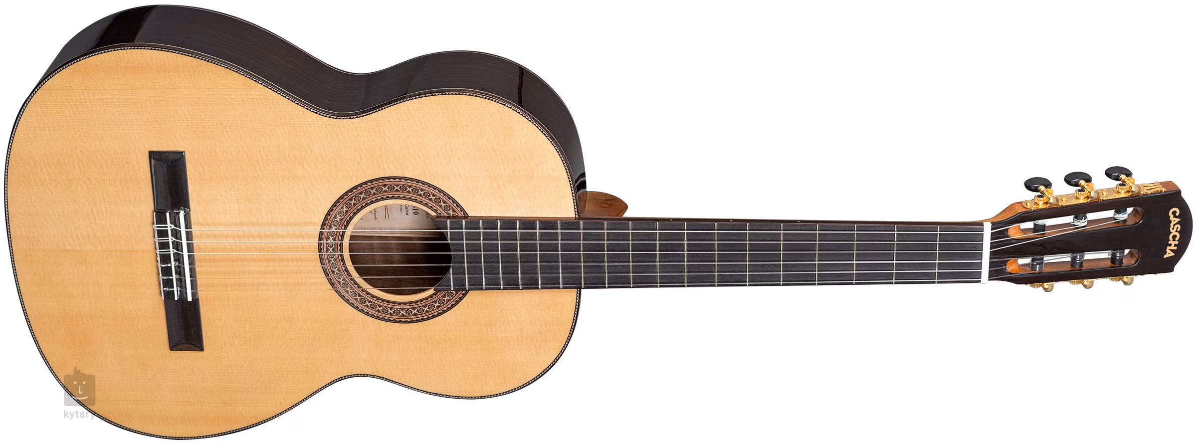 Struny jsou uchyceny v klasických otevřených mechanikách a kobylce z purpleheartu. Pěkné zpracování podtrhuje lesklý finiš přední desky, zdobná rozeta, obvodová lemovka topu doplněná výložkou a hardware ve zlatém provedení. Kytara je dodávána v polstrovaném obalu (8 mm silné polstrování).