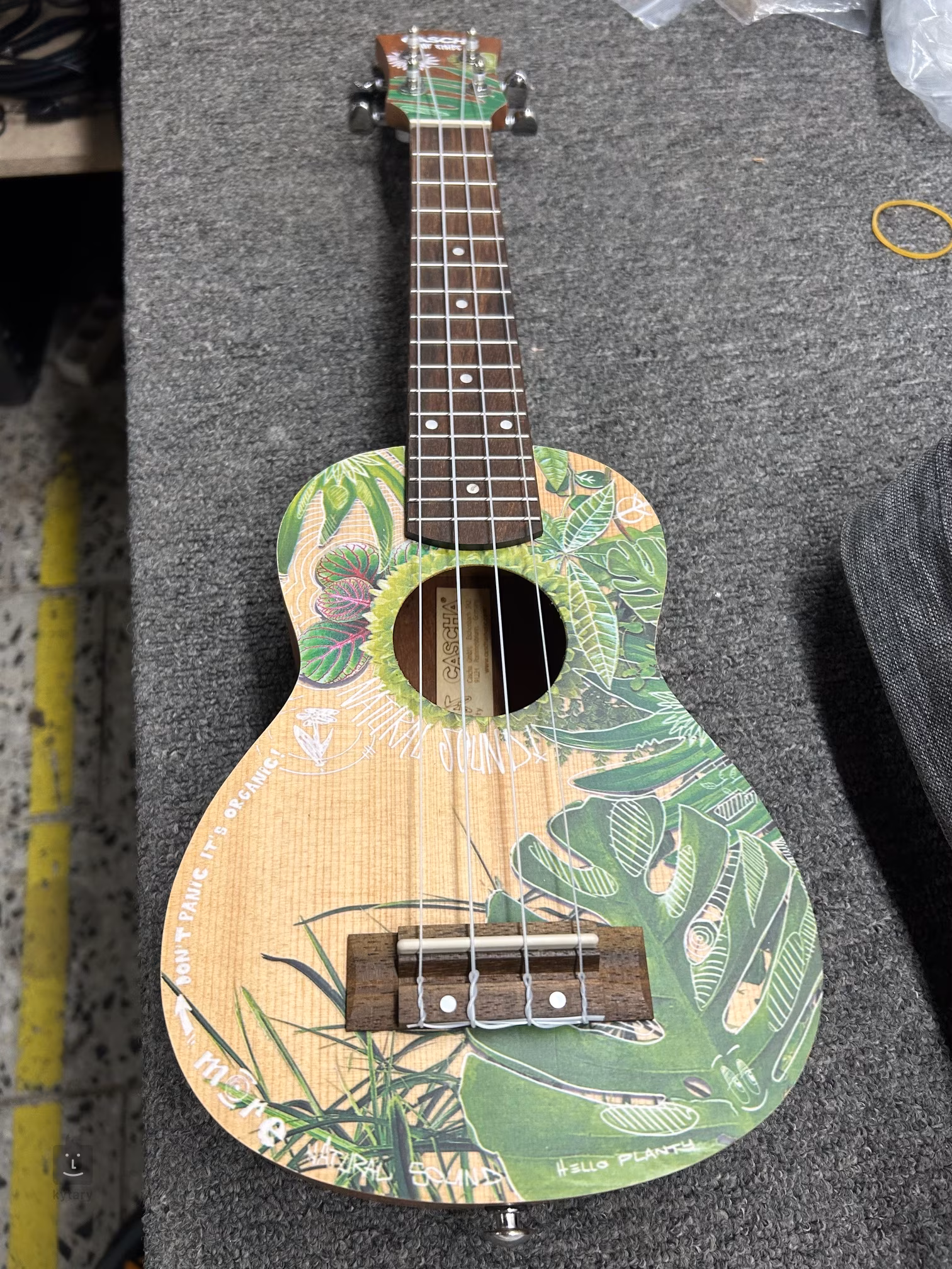 Sopránové ukulele Leafy z řady Art Series značky Cascha nabízí polomasivní konstrukci těla s masivním smrkovým topem a zadní deskou a luby z vrstveného mahagonu. Top a hlavici nástroje zkrášlují grafické motivy, které odlišují ukulele z řady Art Series od méně vizuálně výrazných modelů. Kromě vzhledu se ukulele může pochlubit strunami Aquila Nylgut uchycených v přesných ladicích mechanikách kytarového typu.