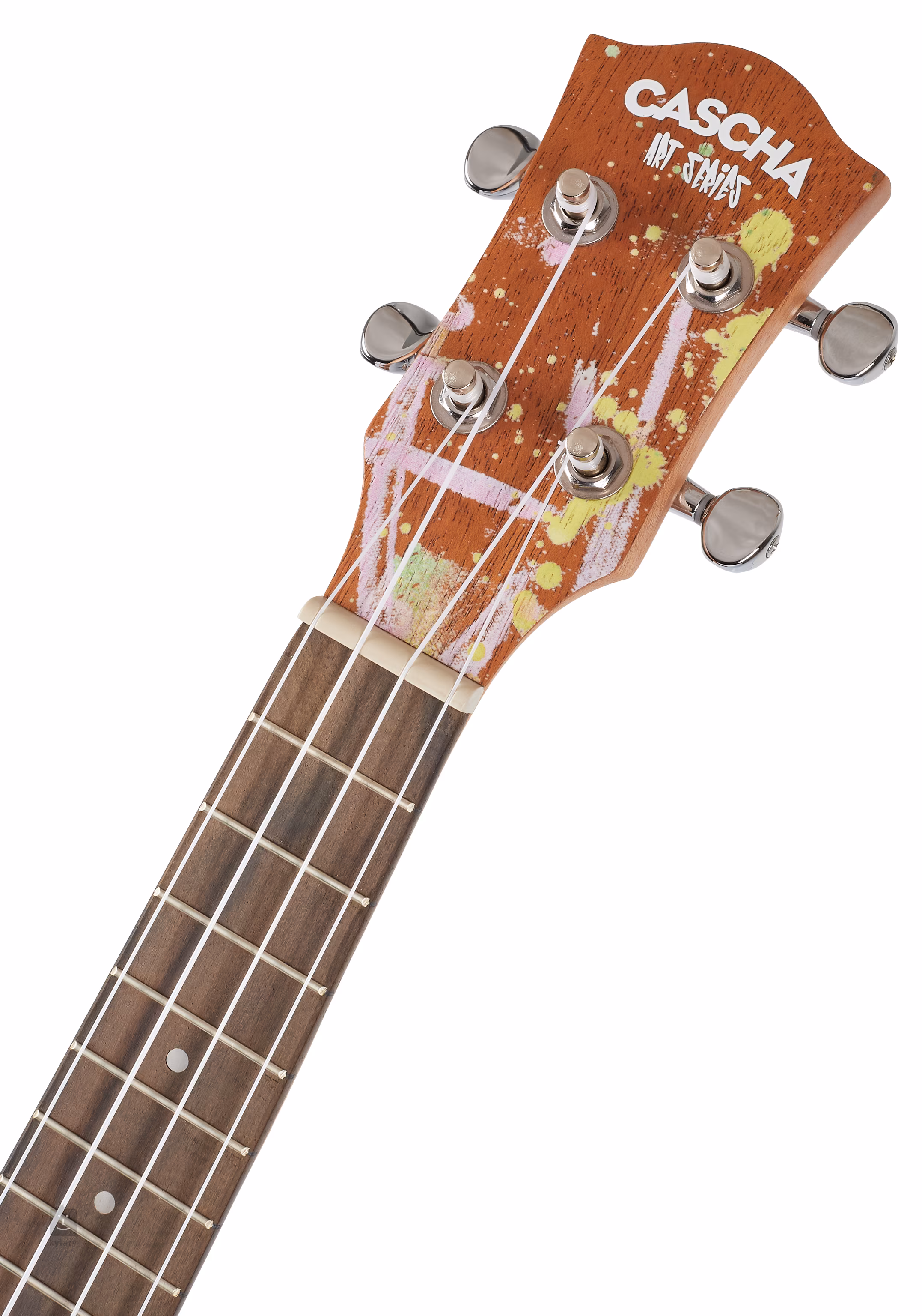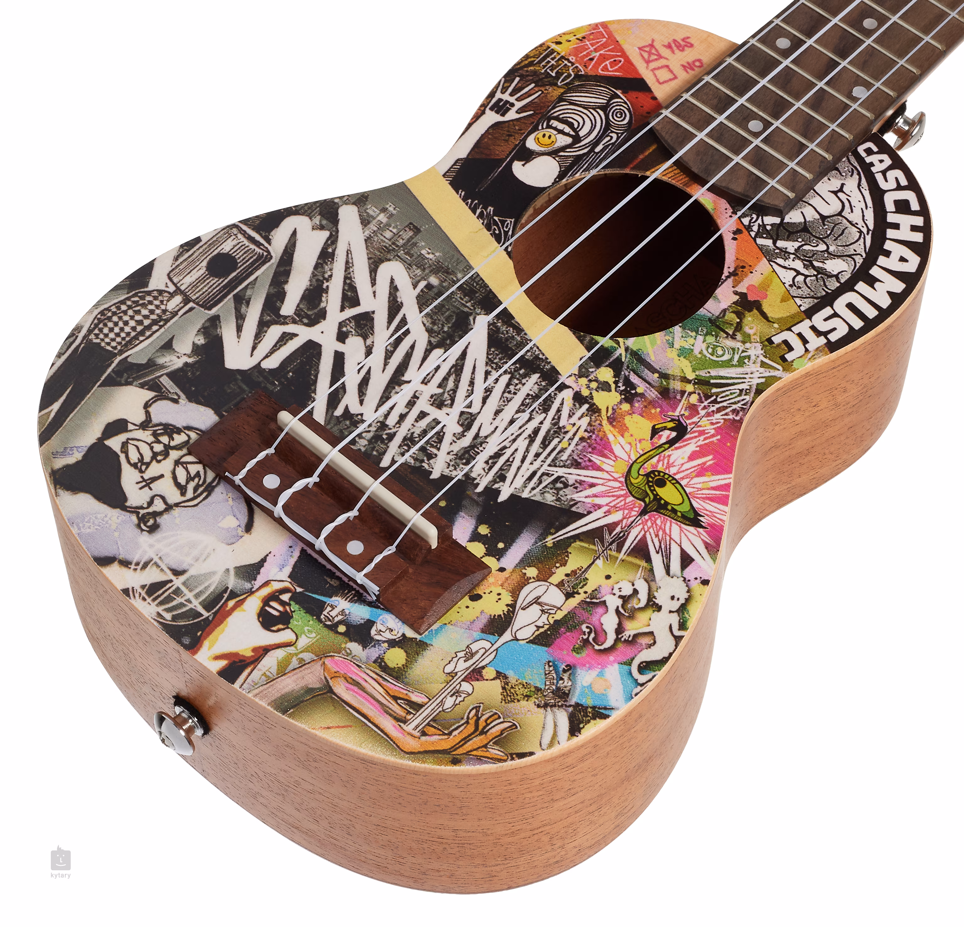 Sopránové ukulele Urban z řady Art Series značky Cascha nabízí polomasivní konstrukci těla s masivním smrkovým topem a zadní deskou a luby z vrstveného mahagonu. Top a hlavici nástroje zkrášlují grafické motivy, které odlišují ukulele z řady Art Series od méně vizuálně výrazných modelů. Kromě vzhledu se ukulele může pochlubit strunami Aquila Nylgut uchycených v přesných ladicích mechanikách kytarového typu.
