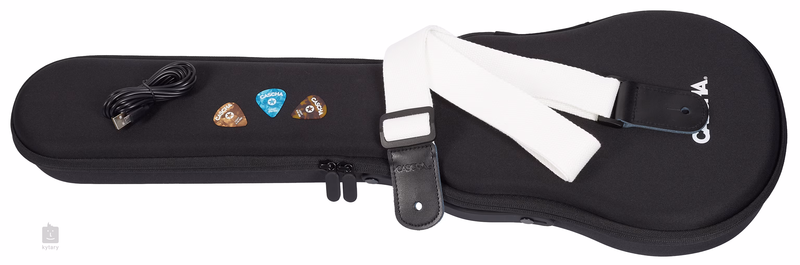 Toto koncertní ukulele značky Cascha je od těla až po hlavici vyrobeno z uhlíkovými vlákny vyztuženého plastu (polykarbonát). Díky tomu nabízí i při nízké hmotnosti vysokou odolnost proti vnějším vlivům a poškození – oproti standardním dřevěným ukulele i odlišný, jasnější, zvuk (k tomu přispívá i druhý, boční, ozvučný otvor). Moderní design nástroje se spodním výřezem těla nabízí dobrý dohmat i na vyšších polohách hmatníku. Dobré ladění strun z fluorokarbonu zaručuje jejich uchycení v otevřených mechanikách kytarového typu.