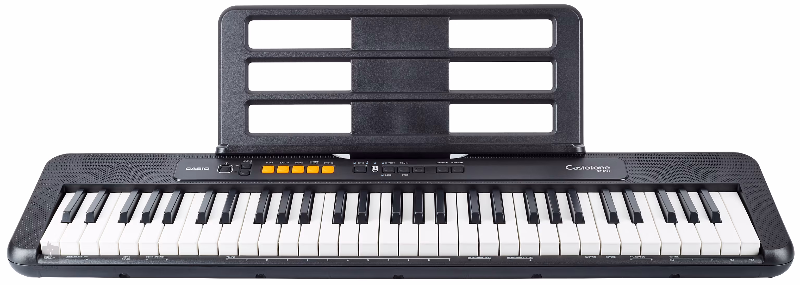 Casio CT-S100 disponuje 61 standardními klávesami, zvukový signál můžete obohatit čtyřmi Reverb efekty, 122 zvukovými rejstříky, nebo využít automatického doprovodu, kdy máte na výběr 61 rytmů. Klávesy dále nabízí integrovaný metronom, tlačítko transpozice/ladění a konektory pro MIDI příjem. O zvuk se postarají dva 2,5W reproduktory a pokud patříte mezi noční hráče, určitě využijete i sluchátkový výstup na zadní straně.