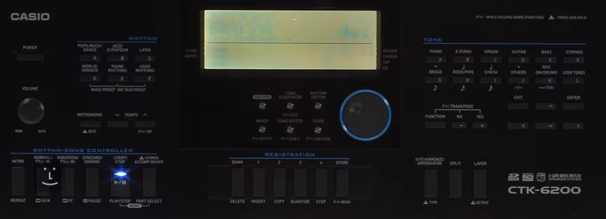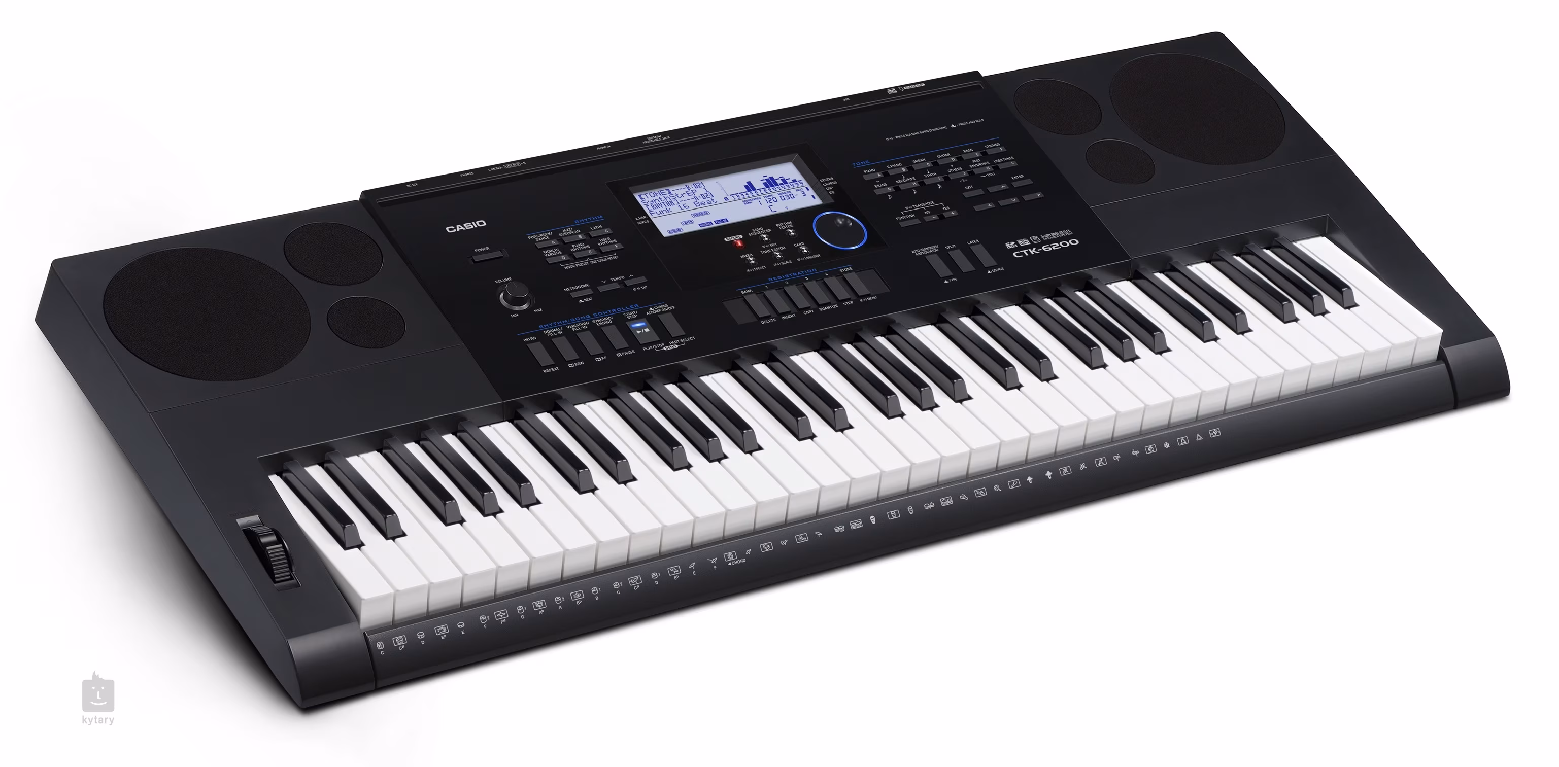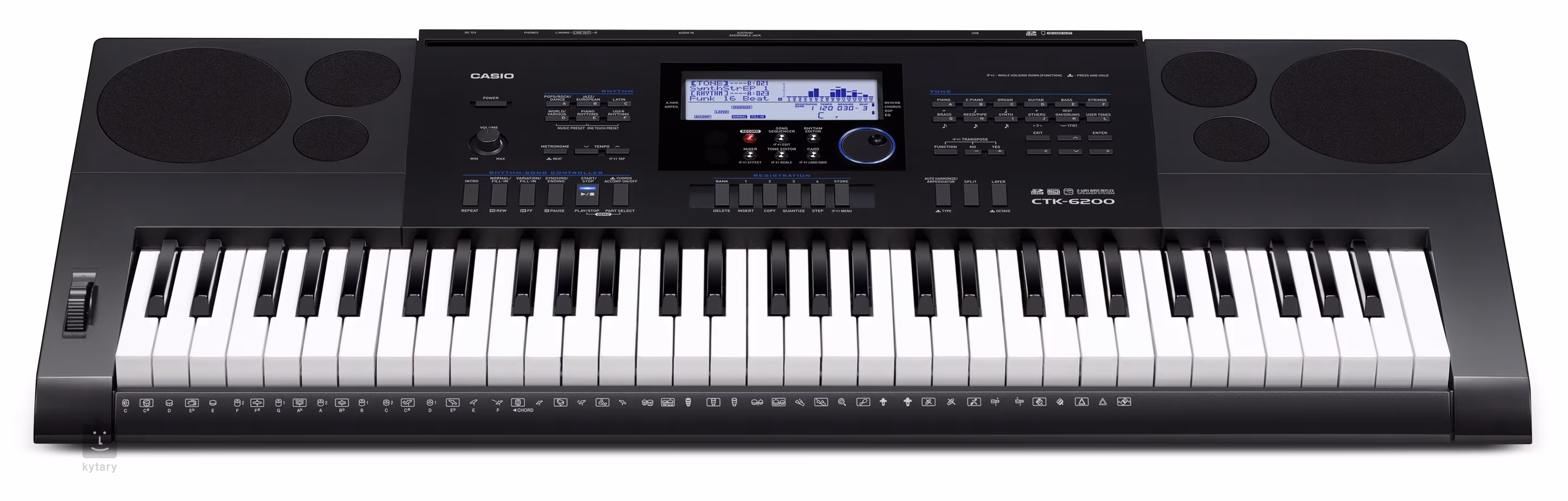 Klávesy Casio CTK-6200 poskytují vše potřebné abyste vaše hudební nápady přivedly k životu. Jednoduchý přístup ke zvukům významně zjednodušuje jejich celkové ovládání a radost ze hry. Najdete zde 700 zvuků, 100 DSP efektů, 10 reverbů a 5 chorusů. Klávesy umožňují tvorbu i vlastních tónů a DSP efektů, které lze následně uložit. Rytmický editor obsahuje 210 rytmů a nabízí dalších 10 volných slotů pro uložení uživatelských groovů. Integrovaný mixpult je vybavený 32 kanály a pomocí sekvenceru se šestnácti stopami nahrajete až 5 skladeb. K dispozici je 32 míst pro ukládání celkového nastavení, což nejvíce oceníte během živého hraní. Zařízení podporuje také paměťové karty (SD, SDHC), které skvěle poslouží k uložení a zpětnému načtení uživatelských dat stejně jako k přenosu a přehrávání souborů ve formátu MIDI nebo SMF 0/1.