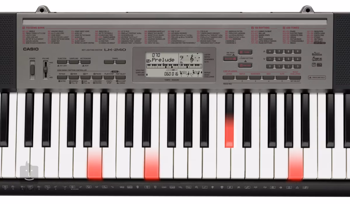 Casio LK 240 jsou vynikajícím modelem z řady kláves s podvícením. Tato jedinečná funkce slouží k zábavné výuce hry na klávesy. Klávesu, kterou máte hrát, poznáte jednoduše tak, že se rozsvítí, tuto funkci kláves ocení nejen děti. Kromě zábavné výuky nástroj nabídne i 400 AHL keybordových zvuků, 150 doprovodných rytmů, 10 digitálních efektů a možnost vytváření vlastních samplů díky mikrofonnímu vstupu. Propojení s počítačem je možné pomocní MIDI přes USB port. Pokud hledáte dostupné klávesy se skvělou výbavou, nemůžete s modelem Casio LK 240 udělat chybu.