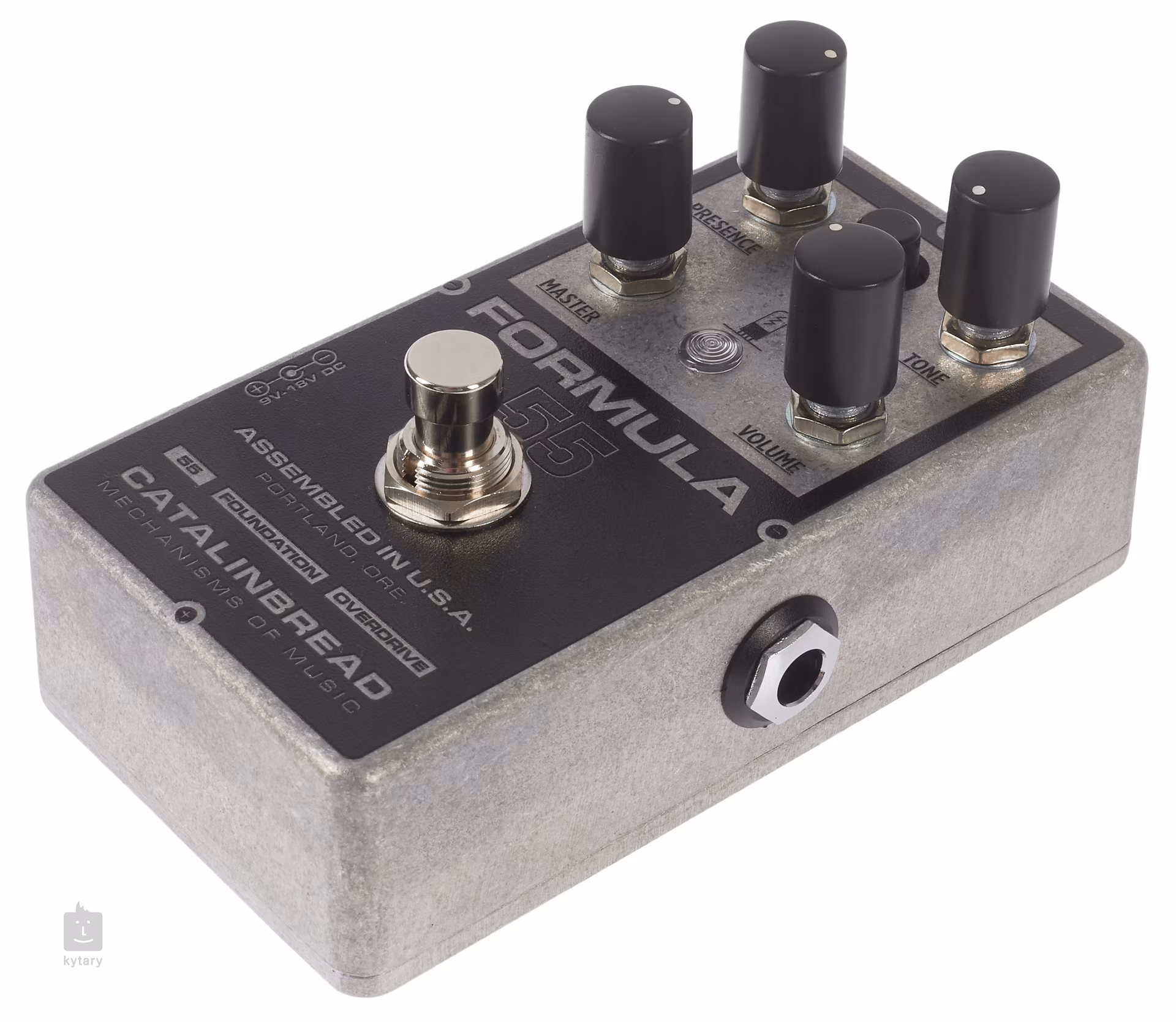 Catalinbread FORMULA 55 je overdrive pedál, který do detailu reprodukuje preamp sekci kytarového komba Fender tweed 5E3 Deluxe. Ovladače Volume a Tone replikují, část po části, obvod 5E3 a poskytují tak krabičce autentickou odezvu tvídových aparátů. Přepínač Hi/Lo nabízí dva odlišné mody gainu - čistší “lower gain” odezvu vintage tweed aparátů (lze přirovnat k preamp lampám 12AY7) a “hot-rodded 12AX7” odezvu elektronek s vyšším gainem.