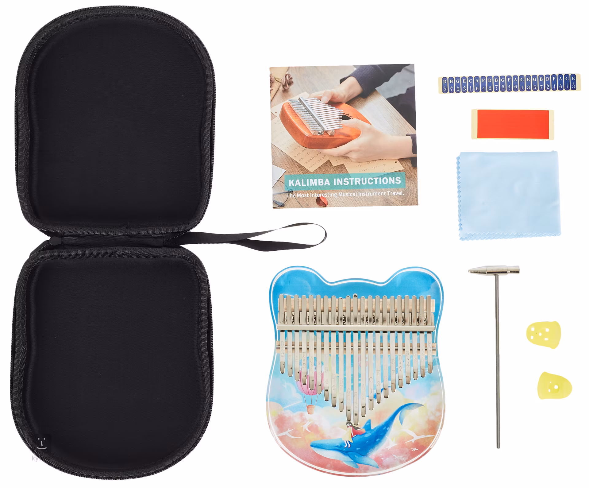 Součástí balení je kromě samotného nástroje také manuál, který vás srozumitelně seznámí s nástrojem a se základní technikou hry, dále pak dva prstýnky, ladící kladívko, čistící hadřík, samolepky na klávesy a cestovní pouzdro.