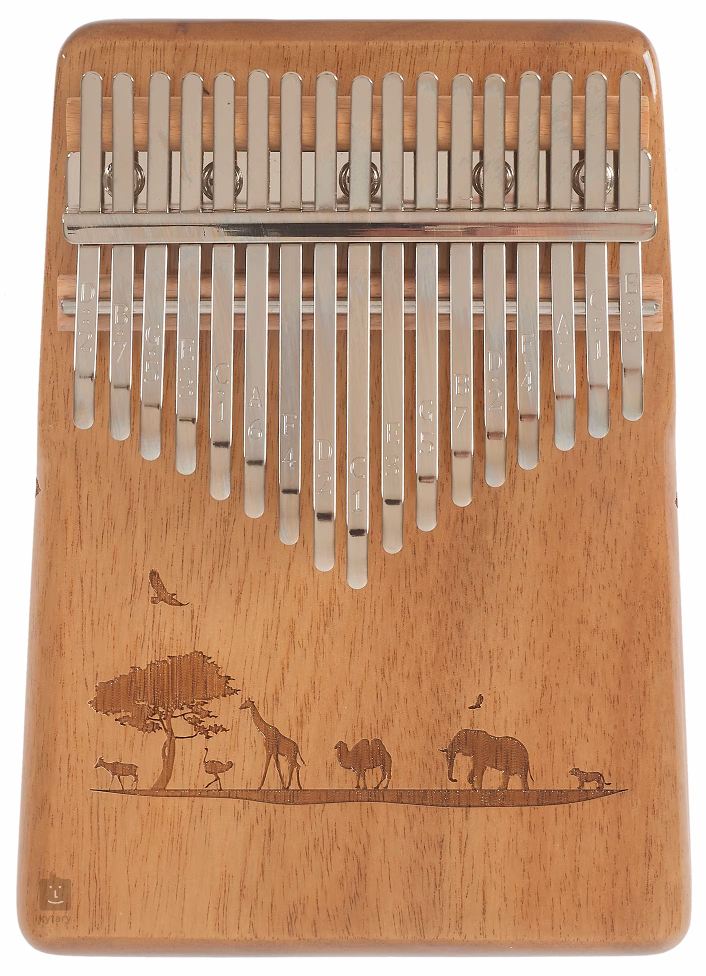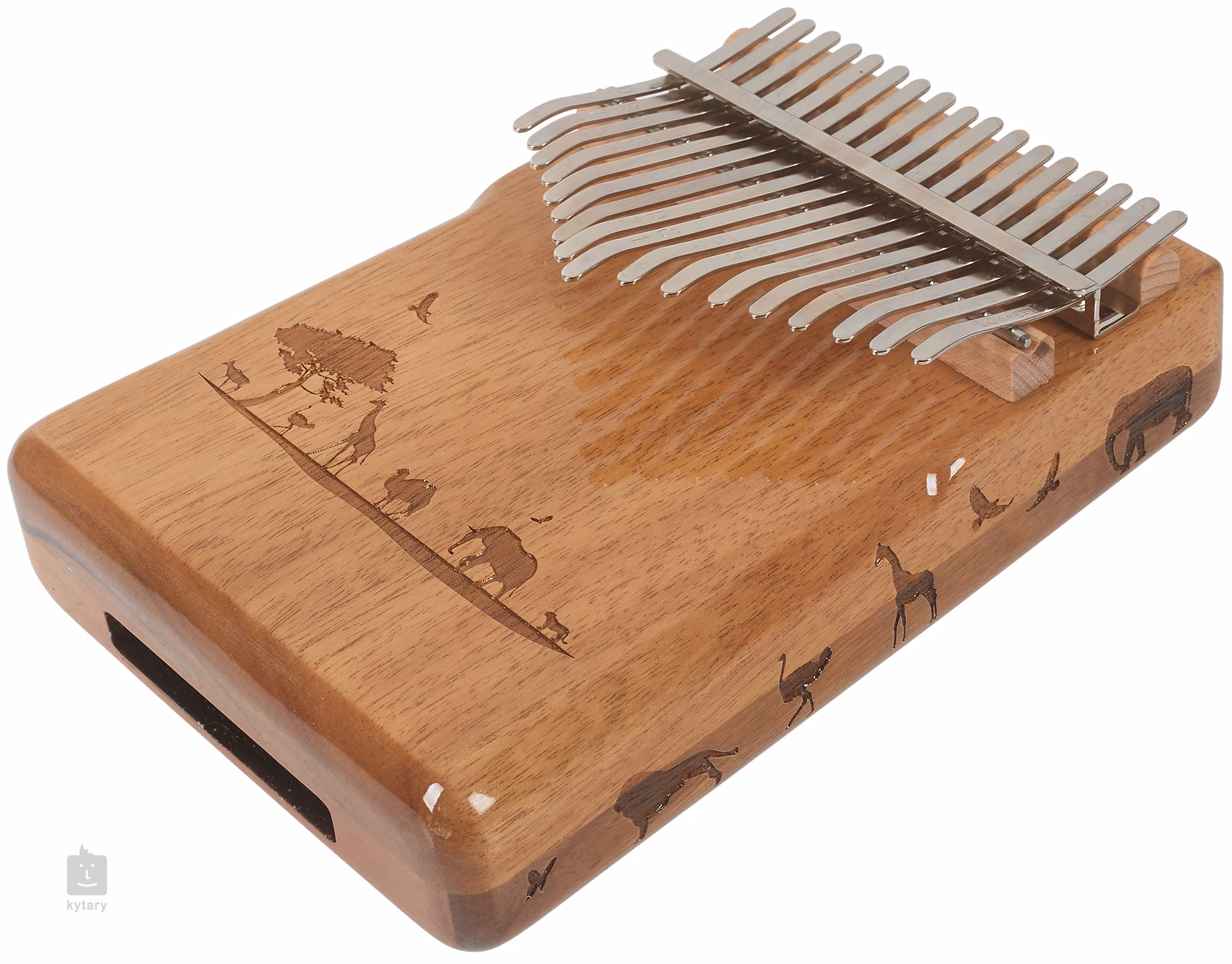 Kalimba z krásné akácie osazená sedmnácti klávesami z karbonové oceli a laděná v C. Zdobená je řezbou kráčející zvěře. Součástí balení je i přepravní obal chránící nástroj proti nežádocímu poškození.