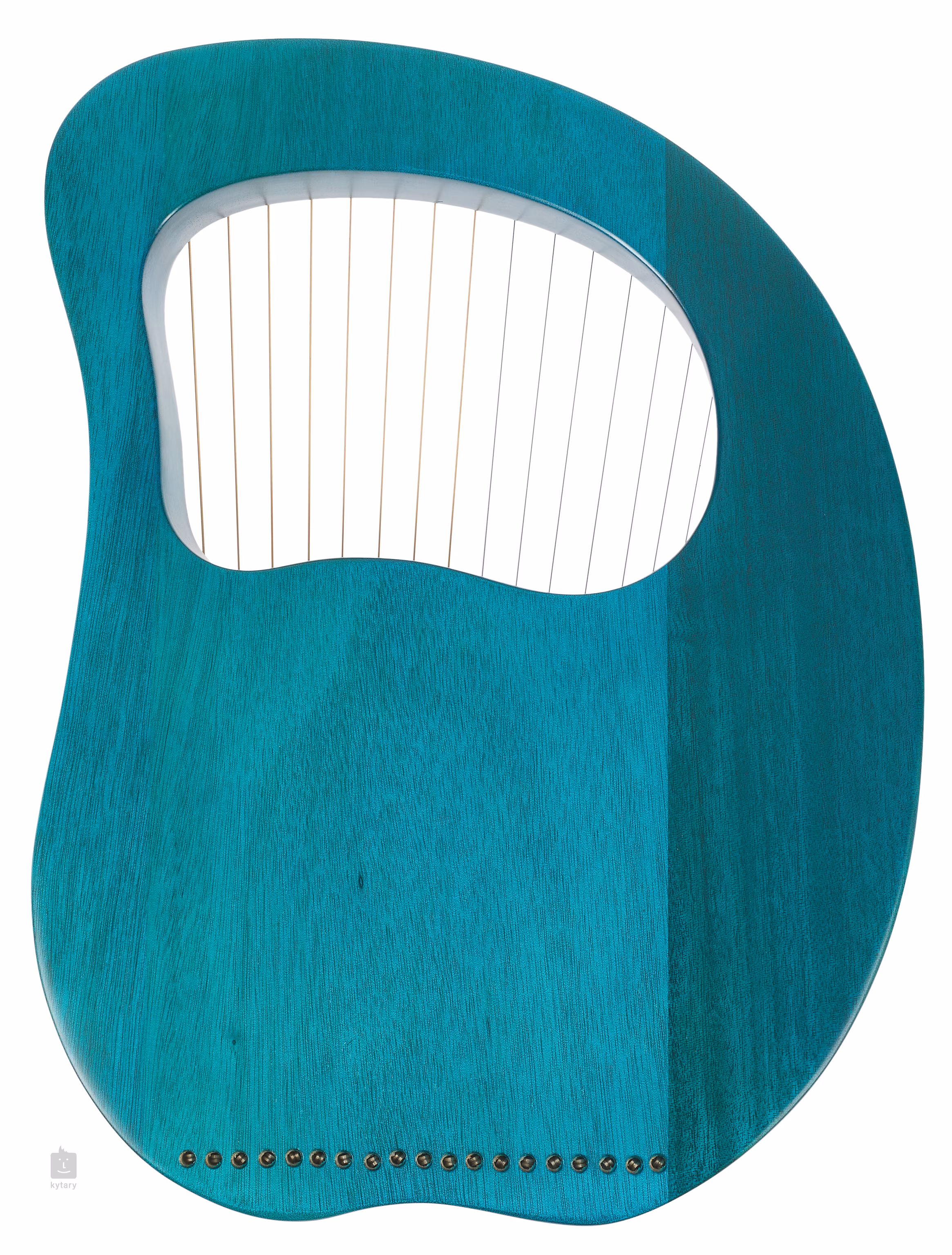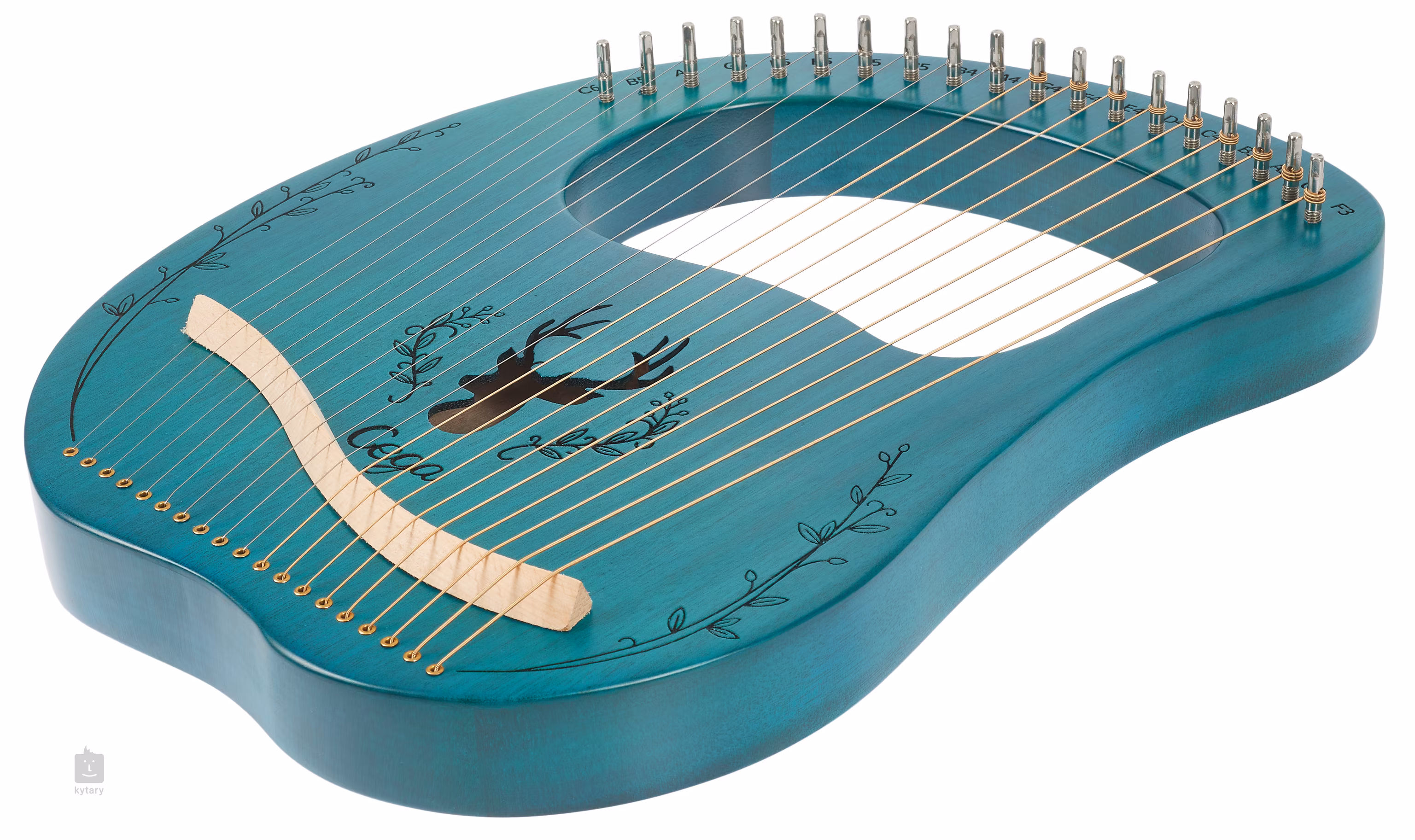Lyra LH19B je v modré barvě, má šestnáct strun a je zdobena řezbou okolo ozvučného otvoru ve tvaru jelena.