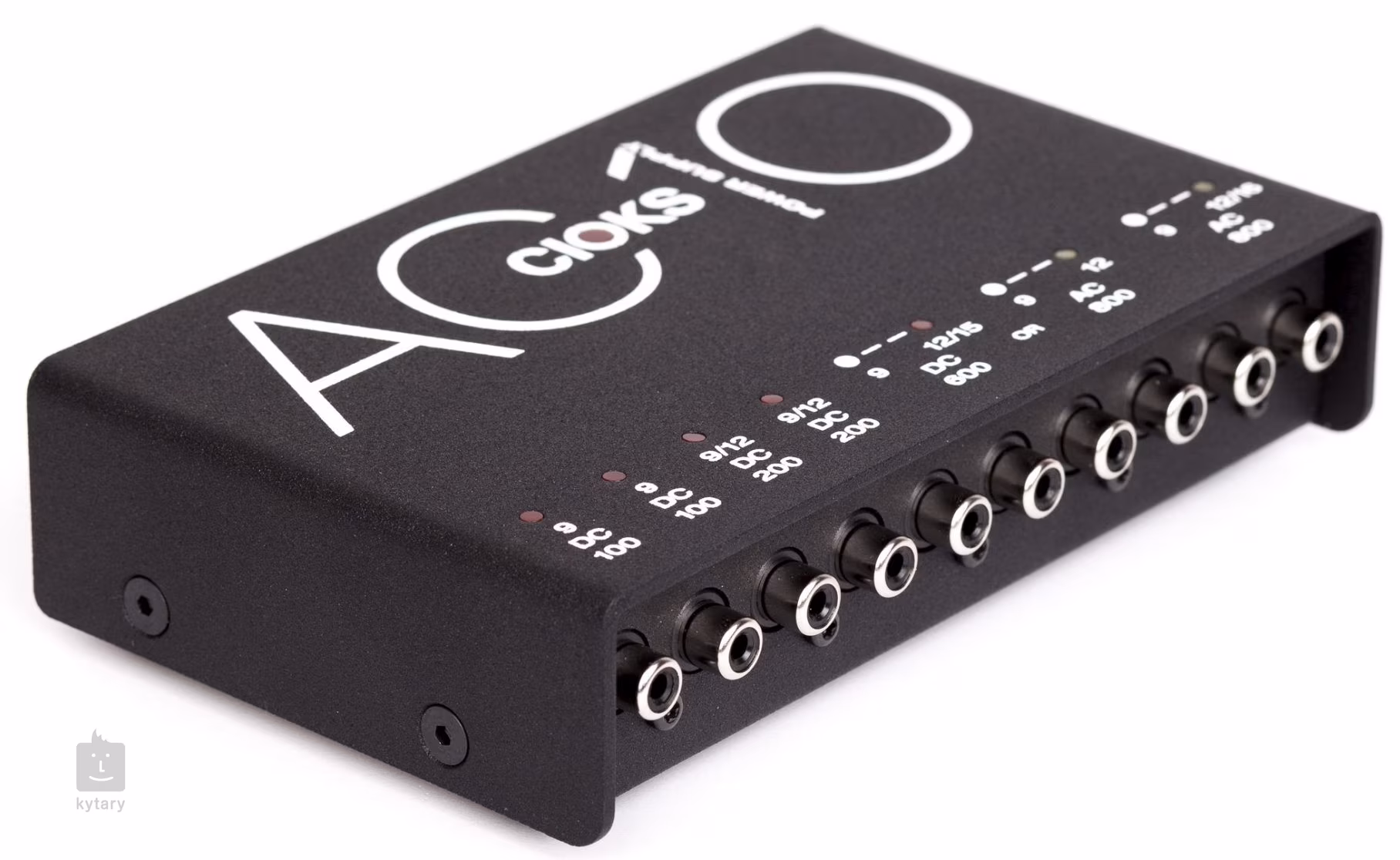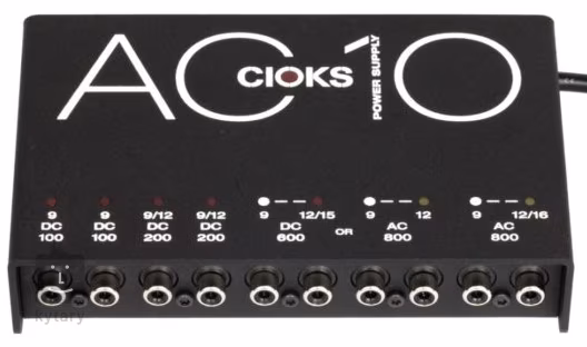 AC10 je součástí řady profesionálních multiadaptérů značky CIOKS a představuje jednoduché, efektivní a spolehlivé řešení pro napájení pedalboardu, kde jeden nebo dva efekty vyžadují napájení střídavým proudem (AC). Nabízí celkem deset výstupů s LED indikací v šesti izolovaných sekcích. První čtyři výstupy jsou určeny pro standardní pedály s nižším/středním odběrem (2x 9V DC/100 mA, 2x 9/12V DC/200 mA). Výstupy 5-8 nabízí dvě sekce, kdy lze používat buď výstupy 5-6 pro DC pedály s vyšším odběrem (1x 9V DC, 1x 12/15V DC) s maximálním proudem 600 mA na sekci, nebo AC výstupy 7-8 (1x 9V AC nebo 1x 12V AC) s maximálním proudem 800 mA na sekci, tzn. nelze používat obě sekce současně. Poslední sekce se dvěma výstupy je určena pro efekty s AC zdrojem napájení (9V AC nebo 12/16V AC) s maximálním proudem 800 mA. AC10 tak bez problému řeší problém s napájením DC pedálů s vysokým odběrem (např. Strymon), DC pedálů s méně obvyklou „voltáží“ (např. Radial Tonebone – 15V), AC efektů (elektronkových pedálů značek EHX a Hughes & Kettner, DigiTech Whammy, JamMan, Talker) nebo modelingových pedálů od Line6 (DL4, MM4). Přepínač síťového napětí (120V a 230V) umožňuje využívat multiadaptér po celém světě.