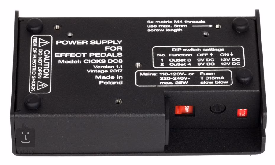 Kompaktnější multiadaptér DC8 je součástí profesionální řady značky CIOKS a představuje jednoduché, efektivní a spolehlivé řešení pro napájení menšího pedalboardu. Nabízí celkem osm výstupů s LED indikací v šesti izolovaných sekcích. První čtyři výstupy jsou určeny pro standardní pedály s nižším/středním odběrem (2x 9V DC/100 mA, 2x 9/12V DC/100 mA). Poslední čtyři výstupy jsou rozděleny do dvou sekcí, každé s 1x 9V a 1x 12V DC výstupy s maximálním proudem 300 mA na sekci. S pomocí DC8 tak budou tak budou ve vašem pedalboardu spolehlivě fungovat i efekty s vyšším odběrem (Strymon, Eventide, TC Electronic Nova, TC Helicon). Přepínač síťového napětí (120V a 230V) umožňuje využívat multiadaptér po celém světě.