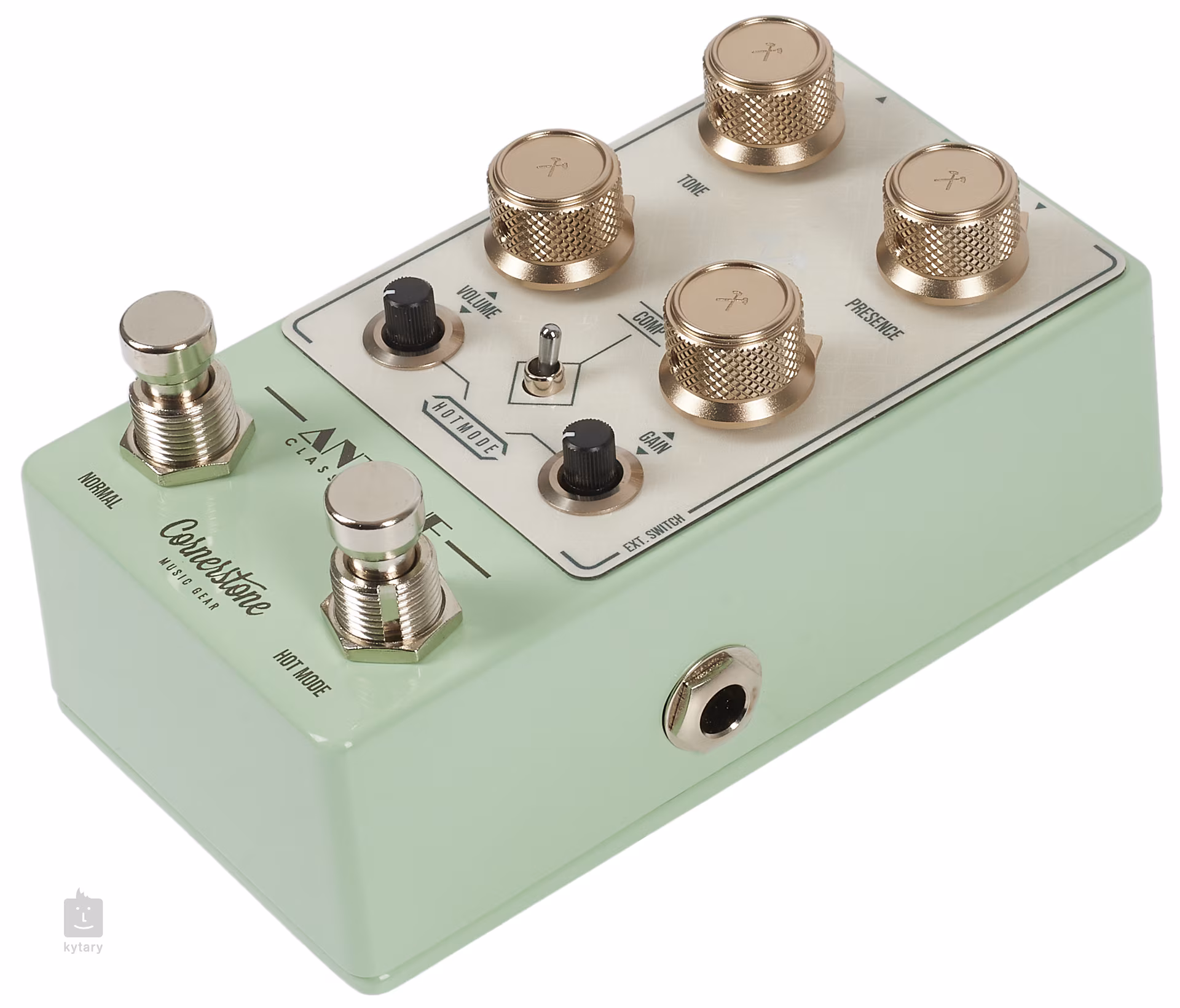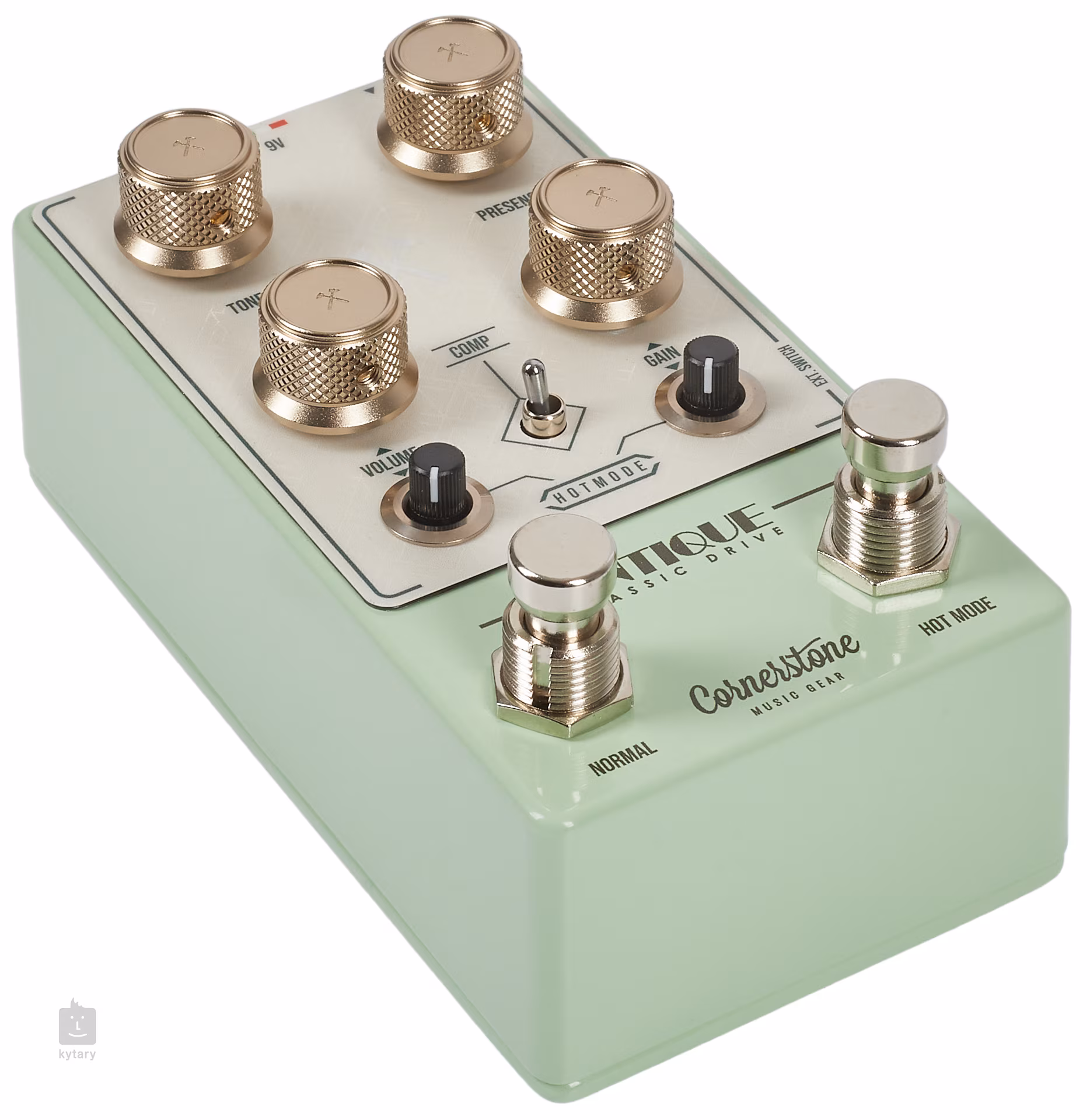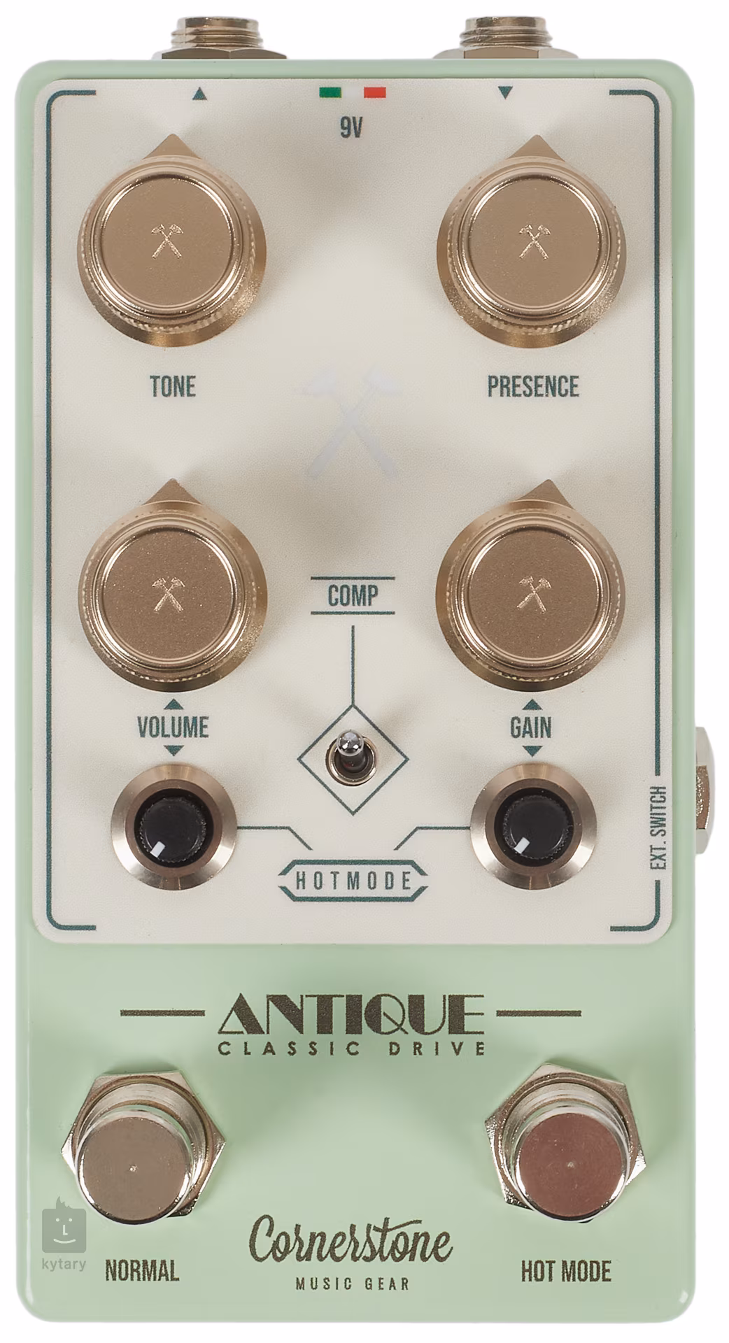 Cornerstone Antique V3 představuje nejen flexibilnější verzi TS pedálu, ale i vylepšení původního pedálu Antique. Jedná se o dvoukanálový TS style overdrive, kdy standardní možnosti nastavení známé z originálu Cornerstone Antique (Normal Mode - Tone, Presence, Volume, Gain, přepínatelná komprese) rozšiřuje samostatně přepínatelný režim Hot Mode se dvěma boostery před a za OD sekcí. Booster a případně pre-gain/post-gain boost přepínač má řada pedálových efektů, ale Antique V3 nabízí pre-OD gain boost a post-OD volume boost se samostatnými ovladači. Jestli se v případě původního modelu Antique mluvilo o flexibilitě, tady to platí dvojnásob - služby krabičky tak neocení jen hráči klasického rocku a blues, ale i jiných, zcela odlišných, stylů.