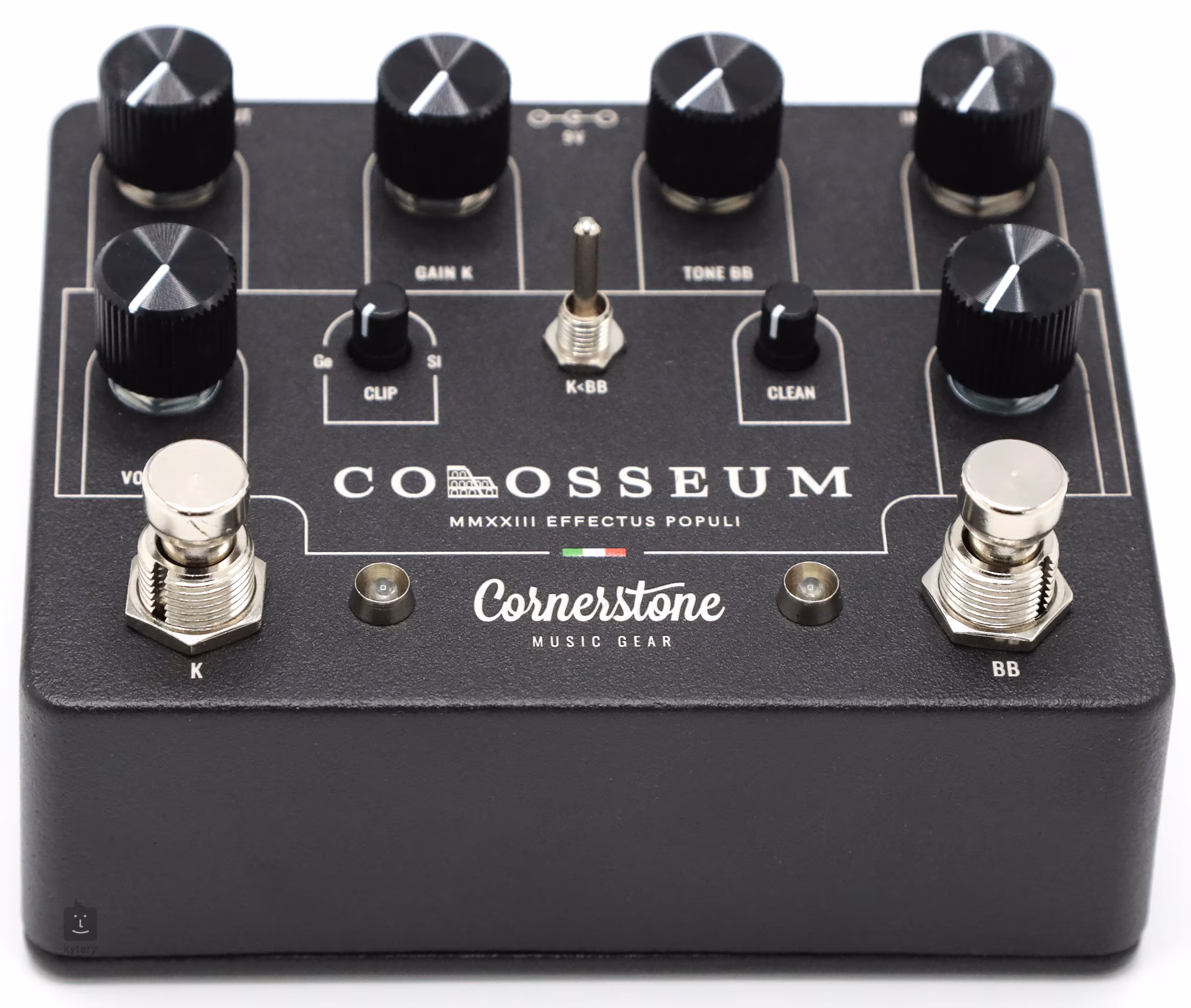 Pedál nabízí dvě sekce – K a BB – které vám umožní ovládat oba obvody nezávisle na sobě. Při zapnutí obou sekcí můžete přepínačem K/BB zvolit jejich pořadí v signálové cestě. Přestože se jedná o věrnou imitaci dvou známých overdrive efektů, Colosseum je v mnoha směrech inovativní. Při aktivaci BB obvodu si budete moci užít zvuk Bluesbreakeru, aniž byste se museli potýkat s jeho známými neduhy jako je nízká hlasitost a příliš temné zabarvení. V Cornerstone navíc přidali ovladač Clean z pedálu Gladio, který do zkresleného signálu přidává čistou zvukovou linku a tím zvýšili zvukovou rozmanitost efektu.