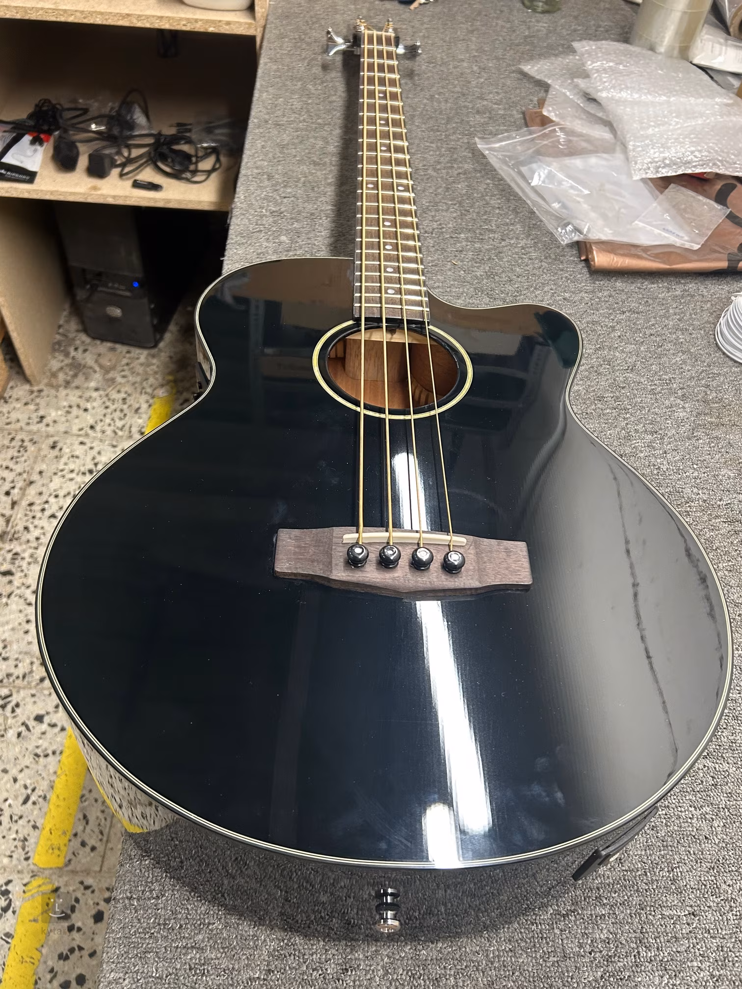 Elektroakustická baskytara Cort AB 850F BK s velkým a hlubokým tělem typu Jumbo nabízí přirozený, dostatečně hlasitý, akustický zvuk s plnými basy. Jedná se o nástroj se standardní menzurou (864 mm). Tělo baskytary je zhotoveno z vrstveného smrku a mahagonu. K mahagonovému krku s pohodlným “C” profilem je přilepen hmatník z fíkovníku osazený dvaadvaceti pražci. Dohmat na vyšších polohách hmatníku usnadňuje spodní výřez těla.