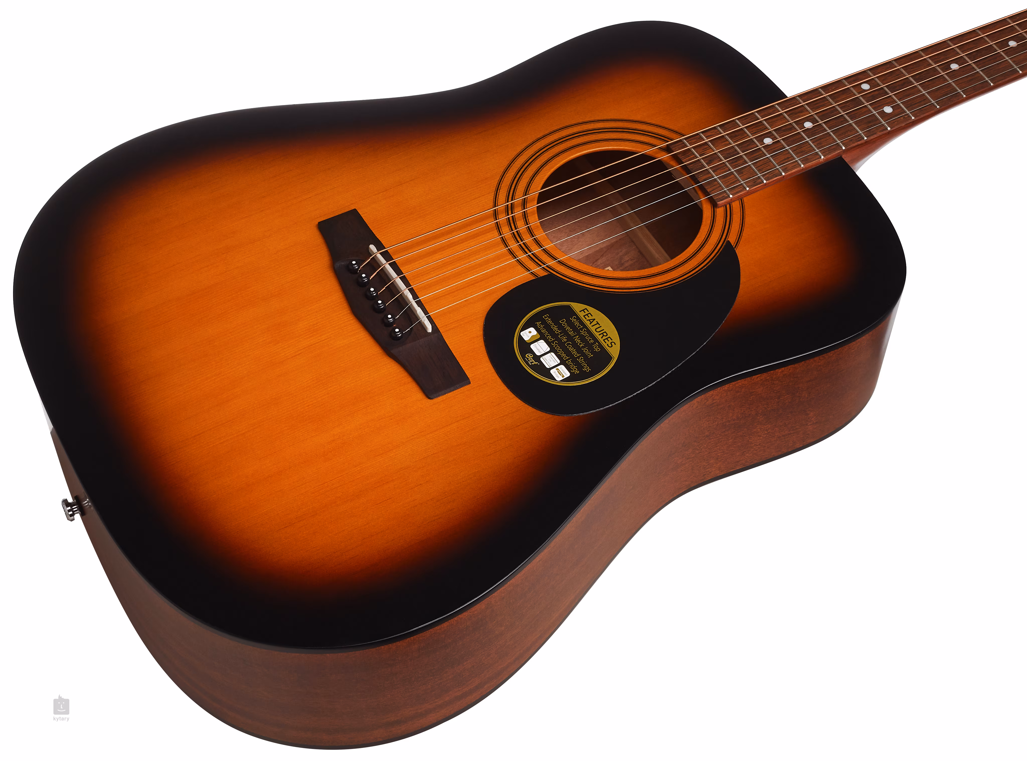 Uchycení strun ve speciálně tvarované kobylce z fíkovníku a chromovaných die-cast mechanikách zaručuje kytaře dobrý sustain a stabilitu ladění. Stylové zpracování podtrhuje pěkná barevná úprava Satin Sunburst, rozeta, logo na hlavici kytary a černý pickguard, který zároveň chrání lak kytary před poškrábáním.