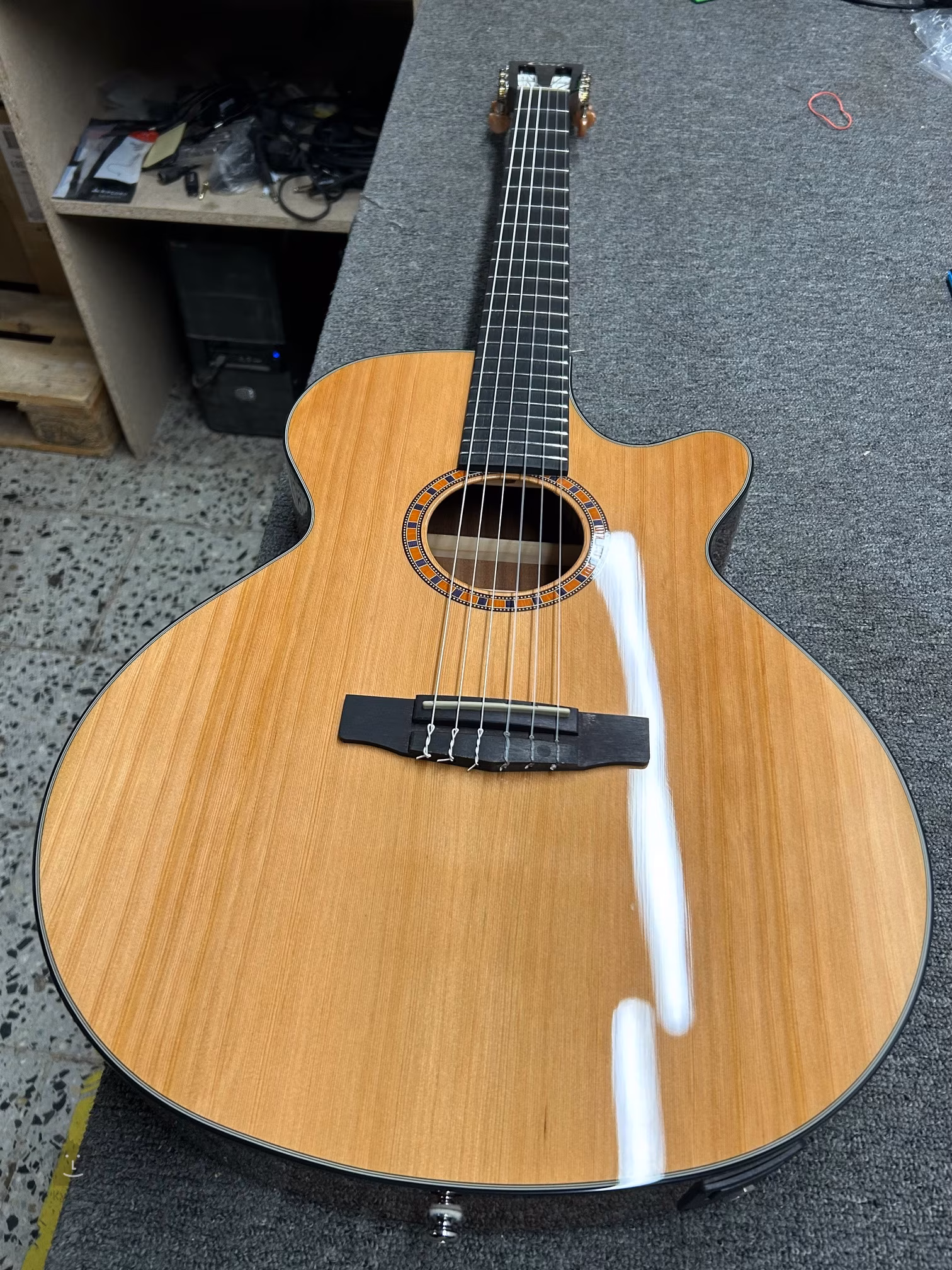 Zdeformovaná, nevzhledná kartonová krabice. Modelová řada Classic v nabídce nástrojů Cort sdružuje nástroje, které lze řadit mezi klasické kytary. Tyto kytary se vyznačují lehce odlišnou konstrukcí a zejména použitím nylonových strun. Kromě opravdu standardních kalsických kytar zde naleznete i nástroje, které designově vychází z jiných typů akustických kytar, ale též používají nylonové struny. Cort CEC 5 je akustická kytara, která svým tvarem vychází z konceptu Jumbo. Přední deska je vyrobena z masivního cedru, luby a zadní deska nástroje jsou zhotoveny z laminovaného mahagonu. K mahagonovému krku je přilepen hmatník z ovangkolu, z kterého je vyrobena i kobylka. Snímání zvuku zajišťuje piezosnímač Fishman Sonicore a preamp Fishman Presys II s dvoupásmovým ekvalizérem, přepínačem fáze a zabudovanou ladičkou. Ladící mechaniky jsou klasického typu. Kobylka nástroje je vytvarovaná tak, aby optimálně přenášela vibrace strun do těla, pevně držela ladění a umožňovala co nejpohodlnější hru. Cort CEC je poměrně jednoduchý nástroj, který ale splní vše, co se od něj dá očekávat, a i mnohem více. Díky této kytaře dostanete perfektní zvuk a kvalitu, a přitom vůbec nemusíte Vaší peněžence pouštět žilou.