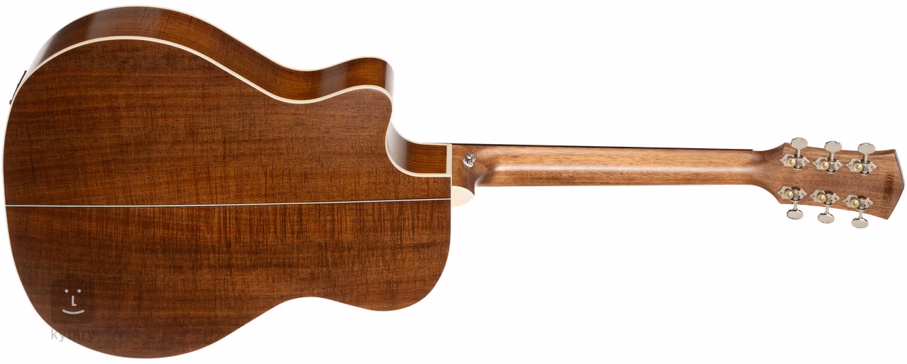 K mahagonovému krku s pohodlným C profilem je přilepen palisandrový hmatník osazený dvaceti pražci. Orientaci na hmatníku usnadňují poziční tečky. Struny jsou přes nultý a sedlový pražec z pravé kosti uchyceny ve firemních otevřených mechanikách a palisandrové kobylce. Stylové zpracování podtrhuje světlá obvodová lemovka těla a rozeta a výložka přední desky ve vzoru rybí kosti (herringbone).