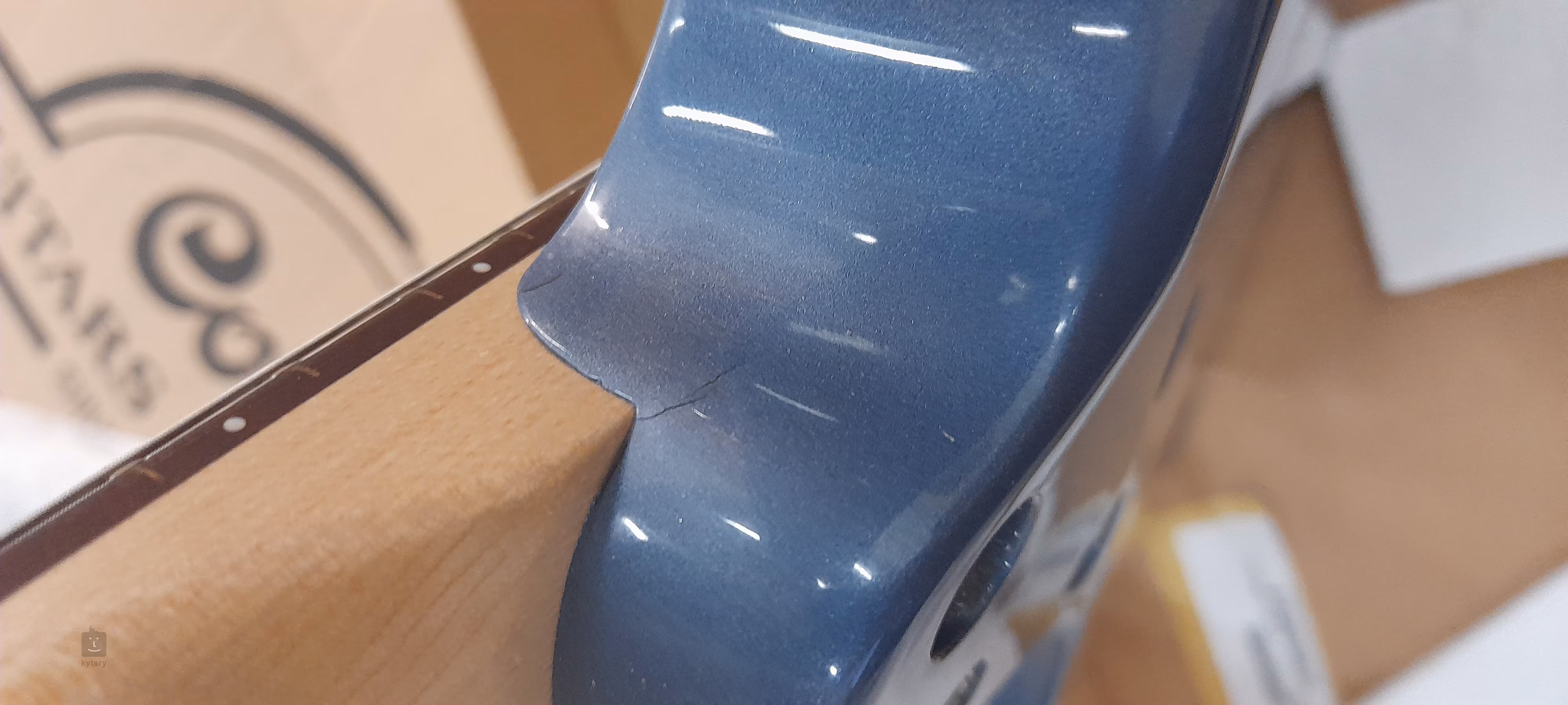 Poškozené zboží - praskliny v laku na spoji krku a těla (viz foto). Jinak zcela v pořádku. Zdeformovaná, nevzhledná kartonová krabice.