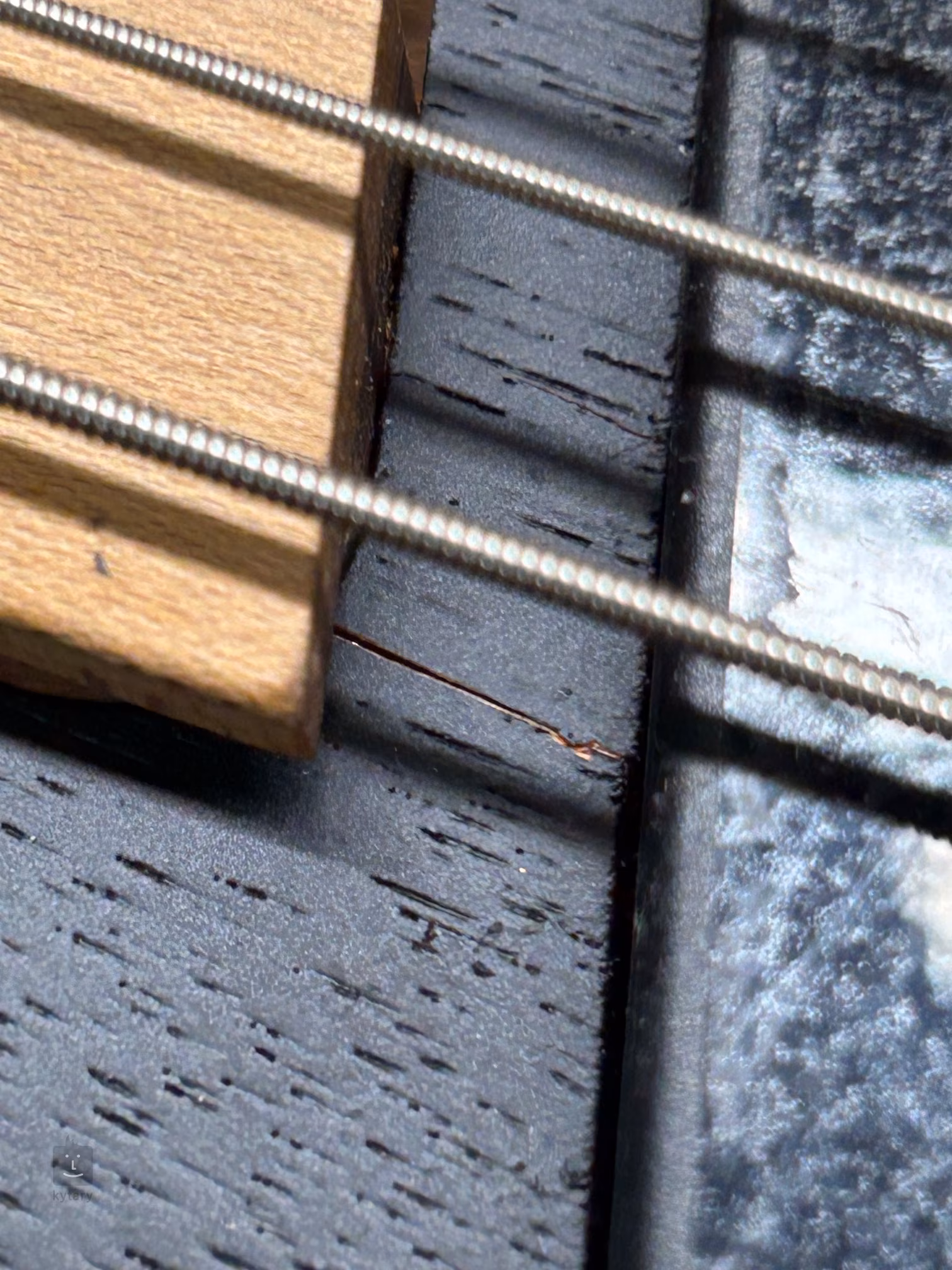 Povrchová prasklina ve dřevě mezi krkem a krkovým snímačem (viz foto). Jinak je nástroj v pořádku a plně funkční.
